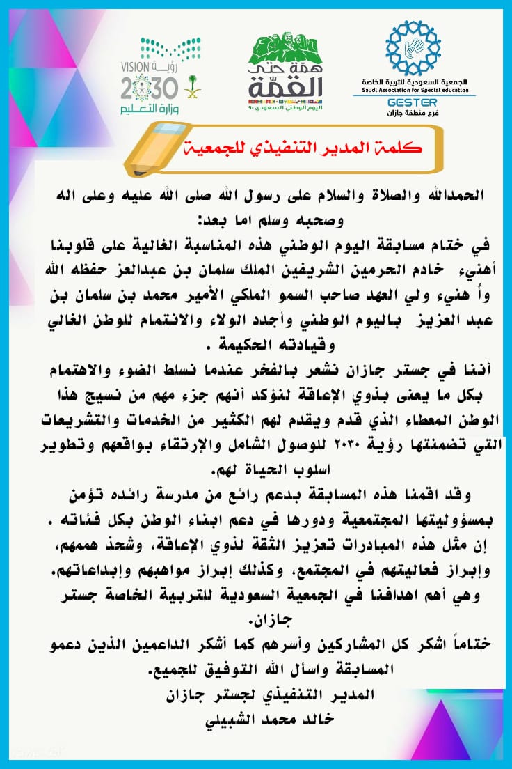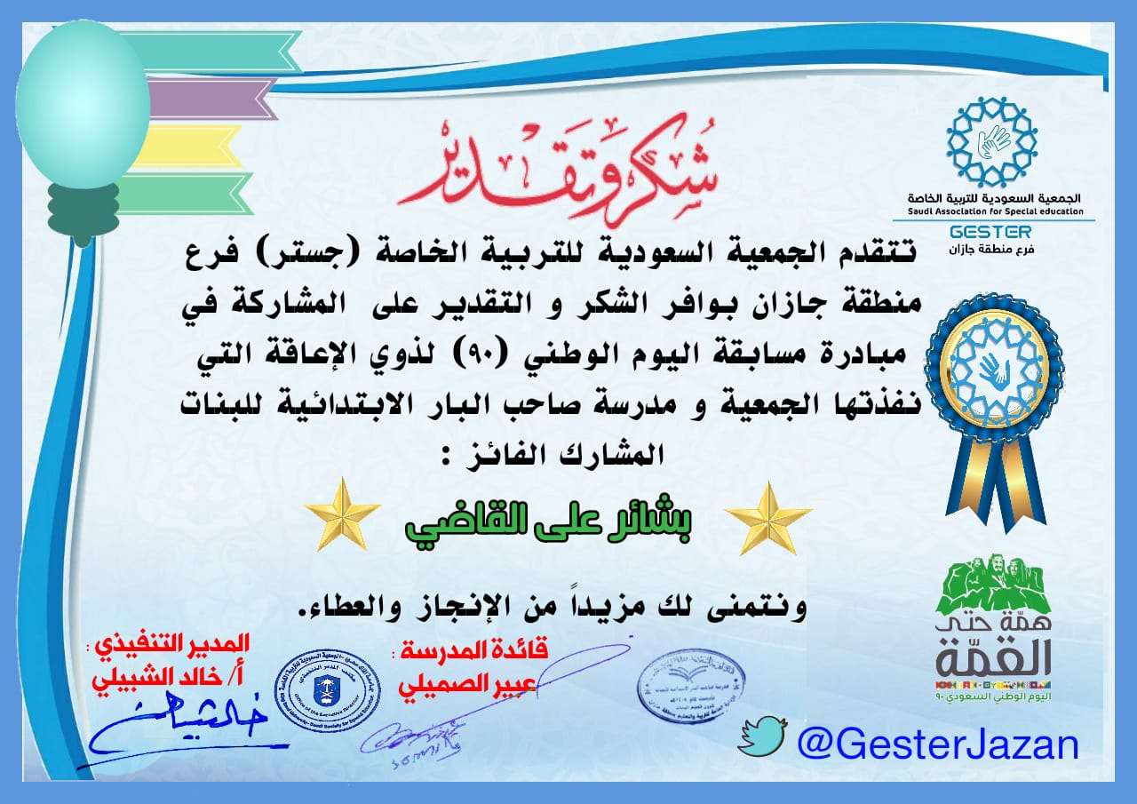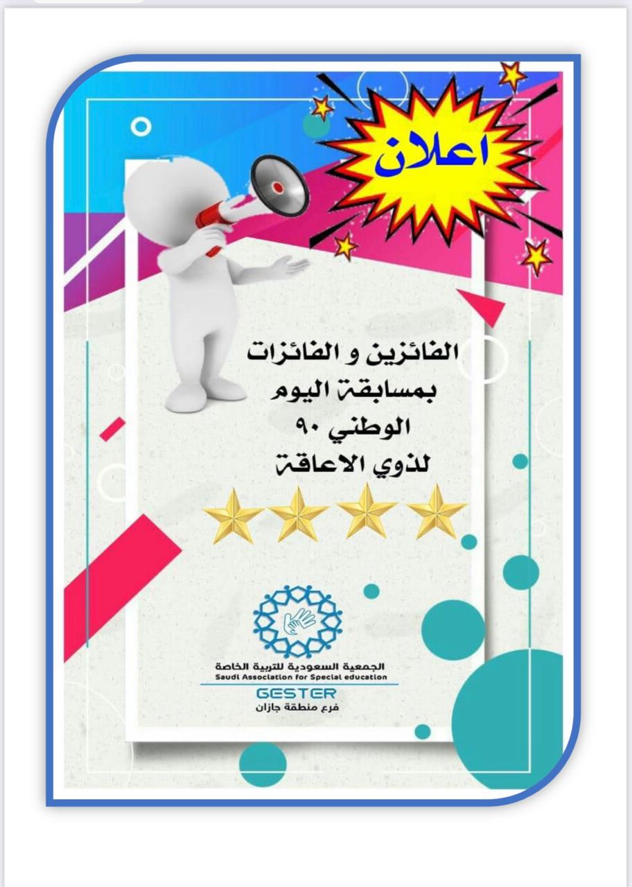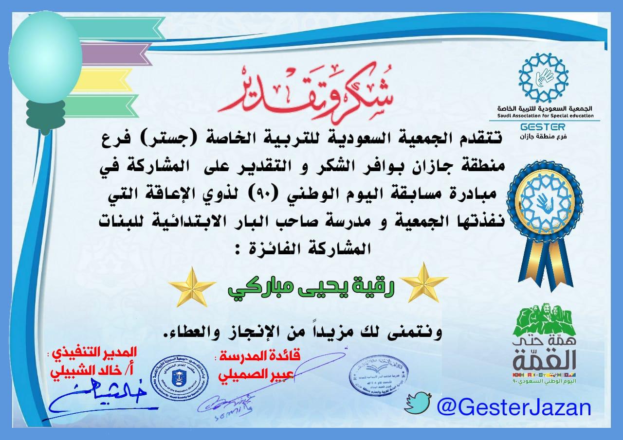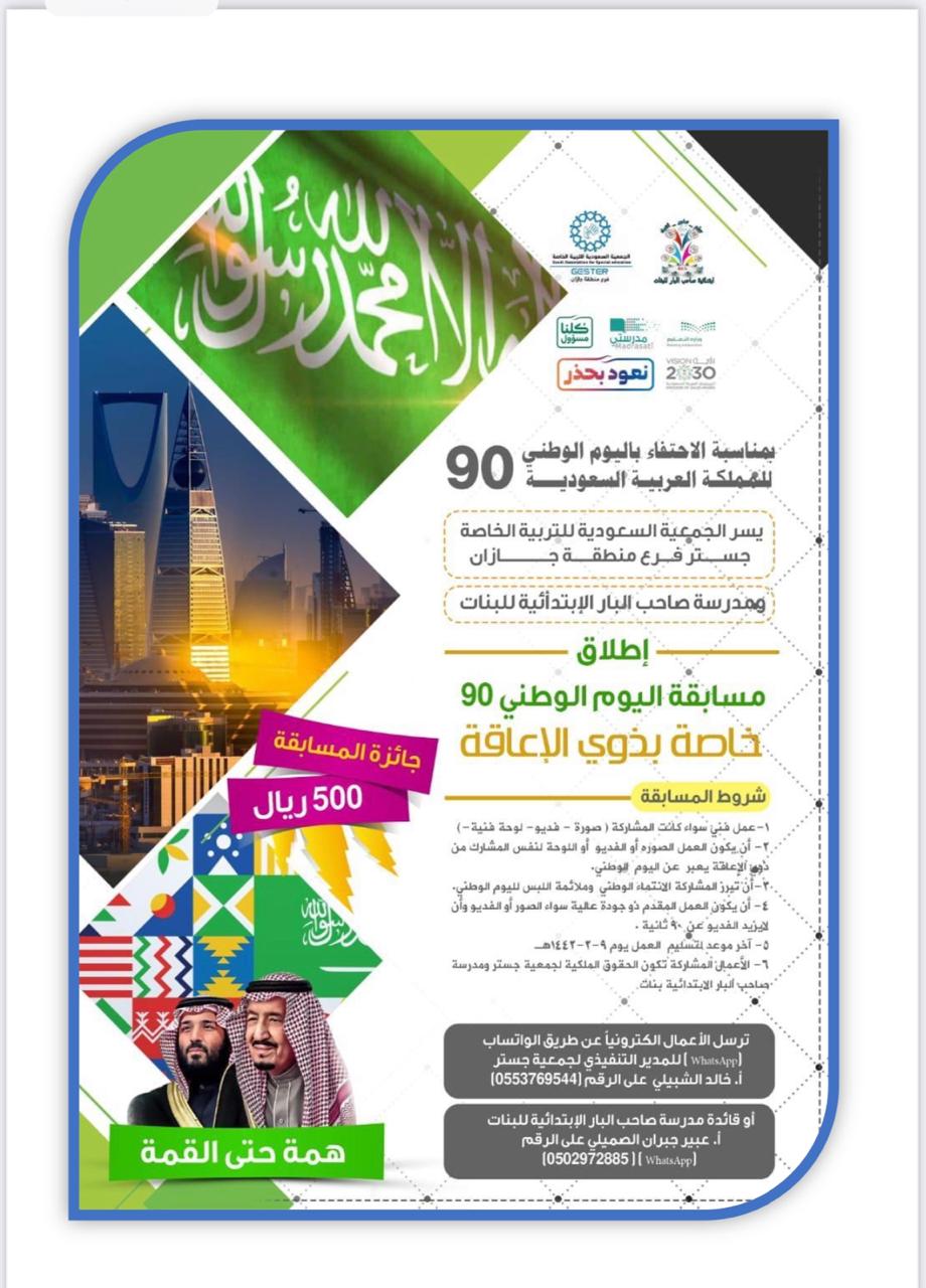 اقامت الجمعية السعودية للتربية الخاصة جستر جازان ومدرسة صاحبة البار الابتدائية للبنات حفلا عبر أون لاين لتكريم الفائزين في مسابقة اليوم الوطني 90 .