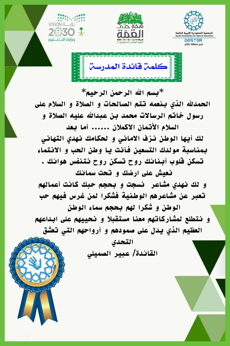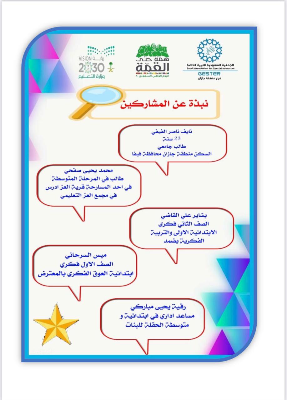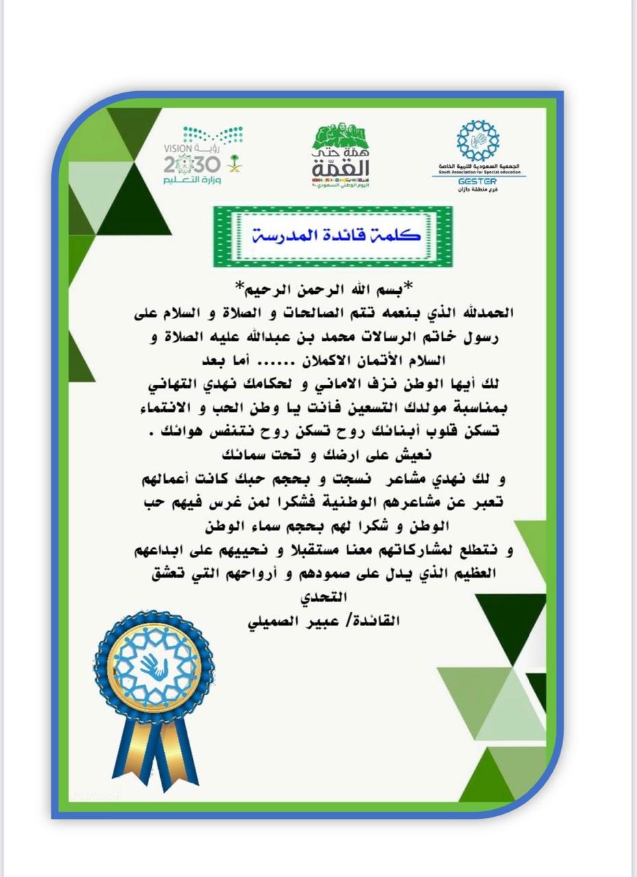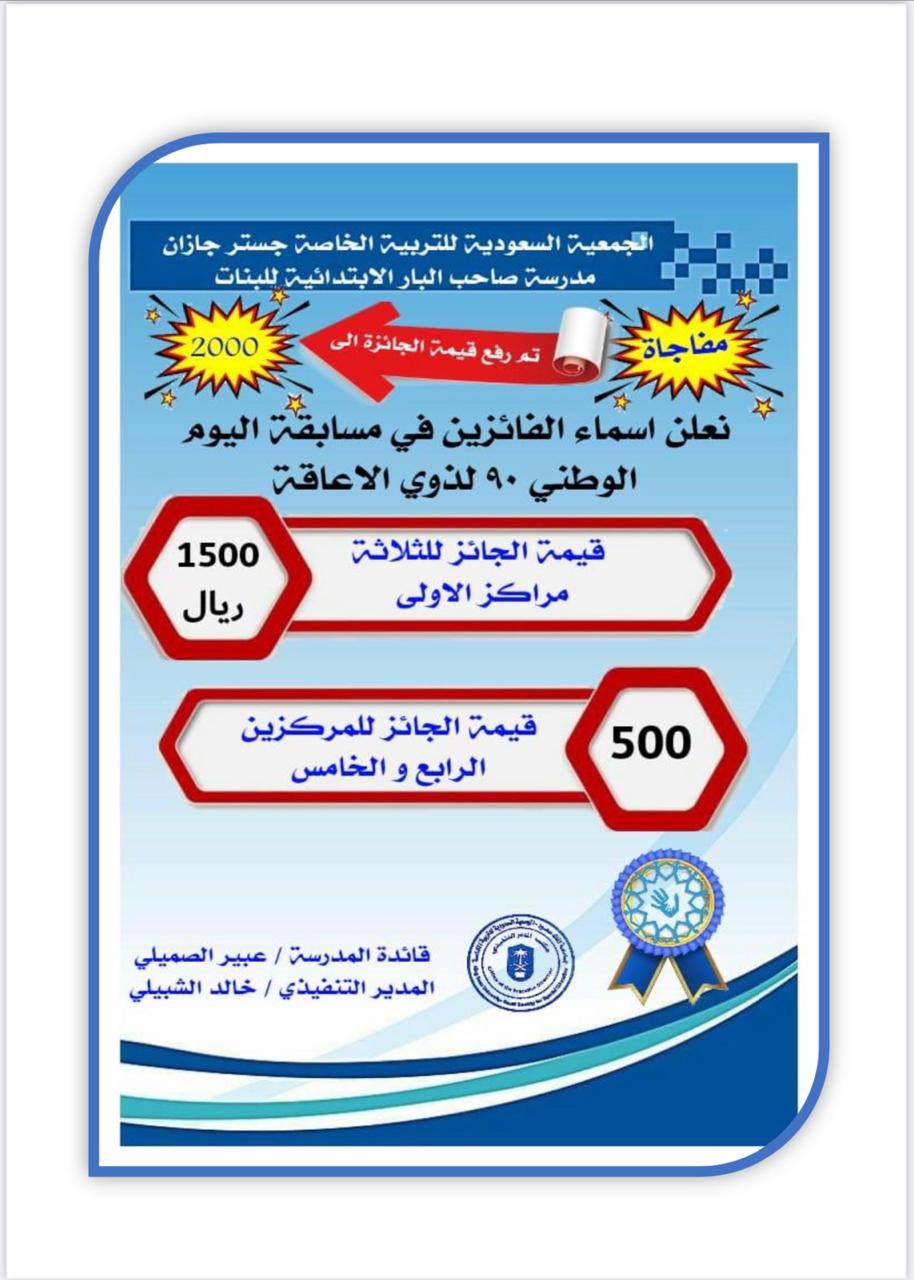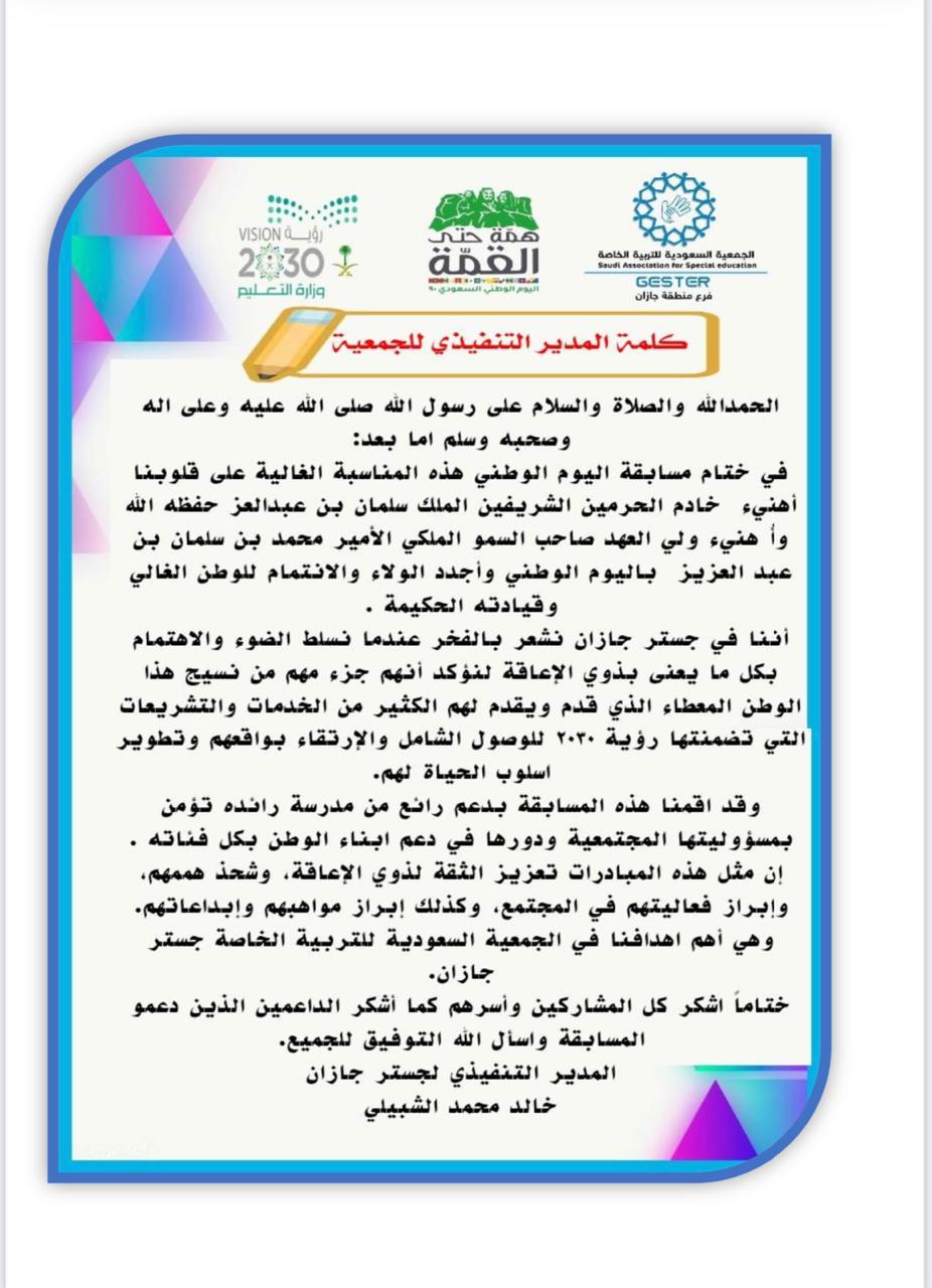اقامت الجمعية السعودية للتربية الخاصة جستر جازان ومدرسة صاحبة البار الابتدائية للبنات حفلا عبر أون لاين لتكريم الفائزين في مسابقة اليوم الوطني 90 .