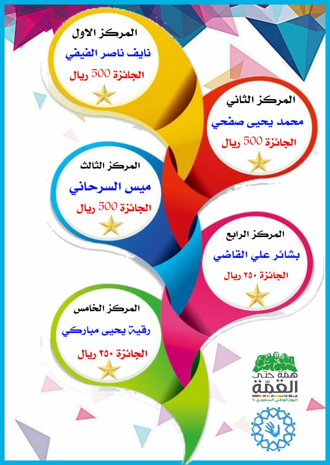 وقد فاز بالمركز الأول نايف ناصر الفيفي وحصل على 500ريالا والمركز الثاني محمد يحيى صفحي 500ريالا والمركز الثالث ميس السرحاني 500ريالا والمركز الرابع بشائر علي القاضي 250ريالا والمركز الخامس رقية يحيى مباركي 250ريالا.