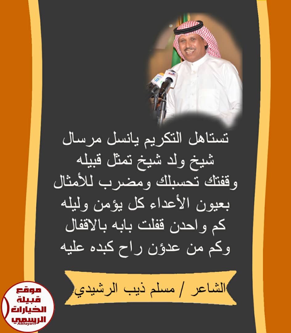 تعتزم قبيلة بني رشيد إقامة حفل تكريم لشاعرها الكبيرناصر بن مرسال الخياري الرشيدي وذلك وسط حضور شيوخ وأعيان قبائل بني رشيد وعدد من مشايخ ووجهاء القبائل الأخرى والشعراء والأدباء .