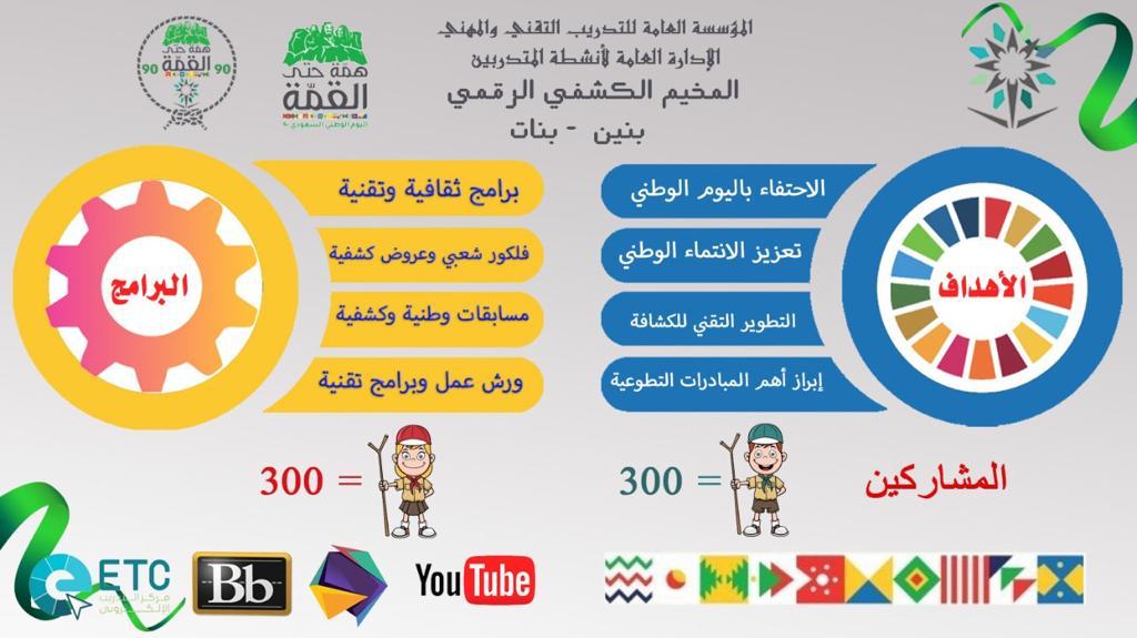 دشن نائب محافظ المؤسسة العامة للتدريب التقني والمهني للتدريب الدكتور راشد بن محمد الزهراني أمس عبر المنصة الإلكترونية “المخيم الكشفي الرقمي” والذي يأتي ضمن فعاليات الإدارة العامة لأنشطة المتدربين للاحتفال باليوم الوطني الـ (90) ، بمشاركة (300) جوال وكشاف وقائد وفي اليوم الذي يليه “المخيم الكشفي الرقمي” للبنات بمشاركة (300) قائدة ومرشدة كشفية من مختلف مناطق ومحافظات المملكة ، وبدء المخيم بالسلام الملكي ، ثم كلمة نائب المحافظ للتدريب الدكتور راشد بن محمد الزهراني رفع فيها أسمى آيات التهاني والتبريكات لمقام خادم الحرمين الشريفين ولسمو ولي عهده الأمين وللجميع بهذه المناسبة الوطنية الغالية ،ورحب بالمشاركين بالمخيم ثم أشار بأن المخيم الكشفي الرقمي للبنين والبنات من المبادرات التي اطلقتها المؤسسة العامة للتدريب التقني والمهني في ظل هذه الظروف الاستثنائية التي يمر بها العالم بسبب جائحة كورونا كوفيد 19 ومنها المملكة العربية السعودية ، ويقام عبر منصات المؤسسة الإلكترونية من أجل ربط قادة وجوالة وكشافة ومرشدات المؤسسة من البنين والبنات بهذه المناسبة الوطنية الغالية على الجميع وتعزيز الانتماء الوطني لديهم وإتاحة الفرصة لهم للتعبير عن حبهم للوطن وولائهم لولاة الأمر في هذه البلد المباركة من خلال برامج متنوعة يتم طرحها خلال فترة المخيم ، وقدم الزهراني شكره وتقديره للقائمين على قيادة المخيم سواء في المخيم الكشفي للبنين والبنات وتمنى للجميع النجاح والتوفيق.