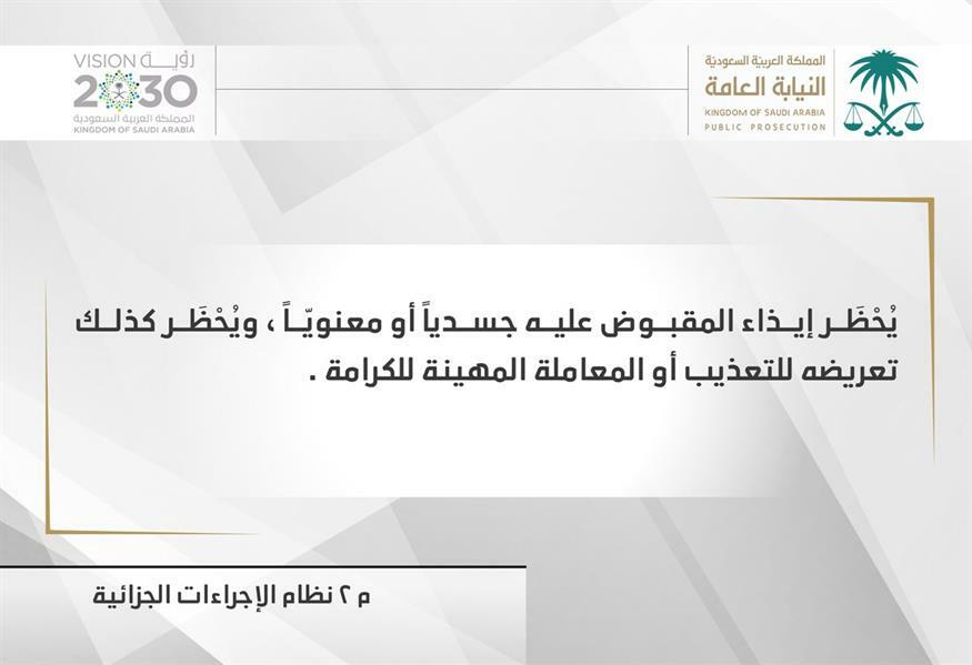 وتنص المادة الثانية من النظام على أن: “يحظر إيذاء المقبوض عليه جسديًّا أو معنويًّا، ويحظر كذلك تعريضه للتعذيب أو المعاملة المهينة للكرامة”.