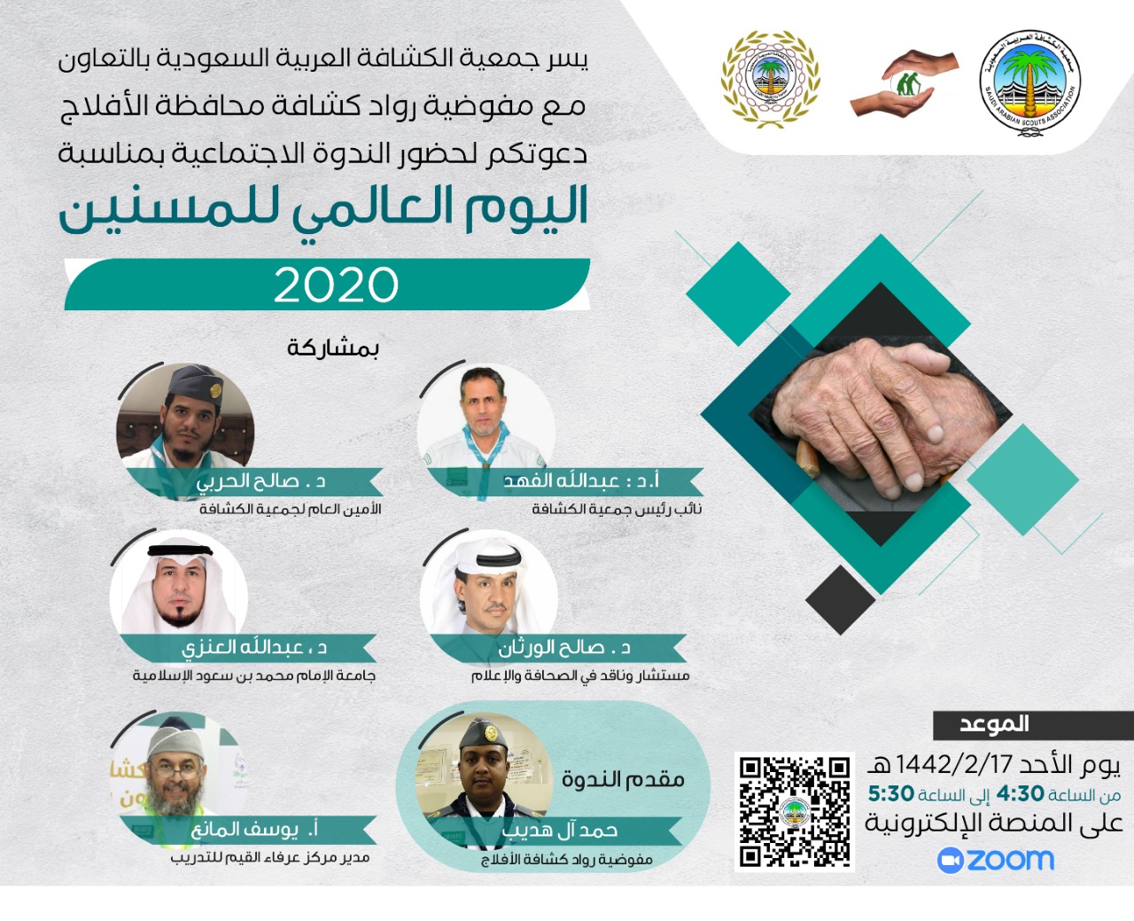 ماهر_عبدالوهاب- جدة: تُنظم جمعية الكشافة العربية السعودية ، يوم الأحد القادم بالتعاون مع مكتب رابطة رواد الحركة الكشفية في محافظة الأفلاج ندوة اجتماعية افتراضية بمناسبة اليوم العالمي للمسنين ، الذي يحتفي فيه العالم في الأول من شهر اكتوبر من كل عام ، لرفع نسبة الوعي بالمشاكل التي تواجه كبار السن، كالهرم، والاحتفال بما أنجزه كبار السن للمجتمع.