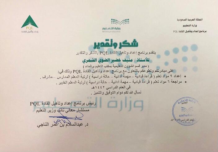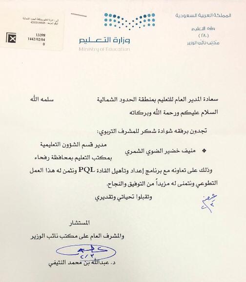 تلقى الأستاذ منيف خضير الضوي(مدير قسم الشؤون التعليمية في مكتب التعليم برفحاء) خطاب شكر وتقدير من رئيس برنامج إعداد وتأهيل القادة PQL مستشار معالي نائب وزير التعليم د/ عبدالسلام عمر الناجي، وذلك للتعاون مع البرنامج في إعداد (٩) مواد تعلم( قراءة قيادية، مهمة أدائية، حالة دراسية) لرتبة المعلم الممارس- مشرف، ولمراجعة(٦) مواد تعليم( قراءة قيادية، مهمة أدائية، حالة دراسية)لرتبة المعلم الخبير للعام الدراسي١٤٤٢هـ.