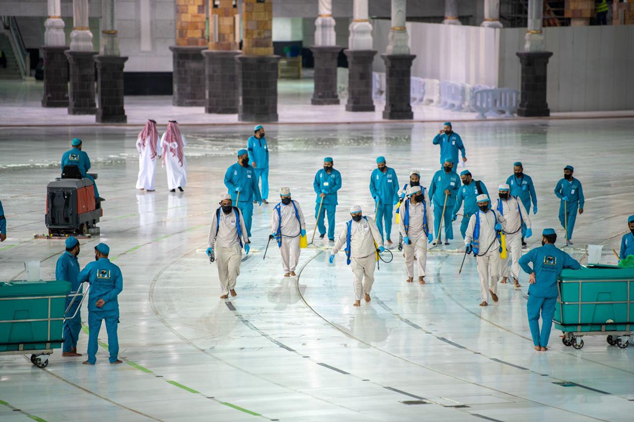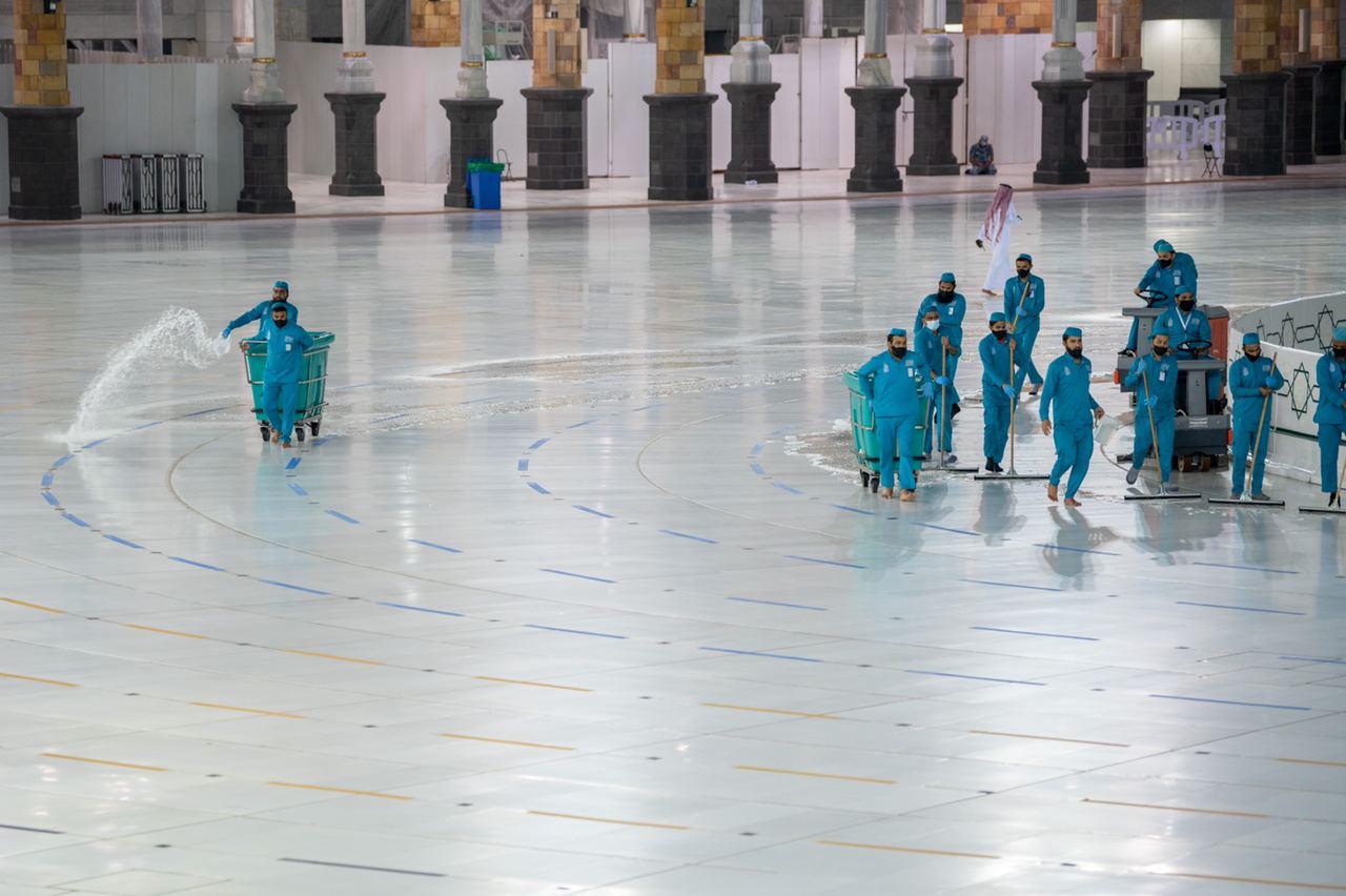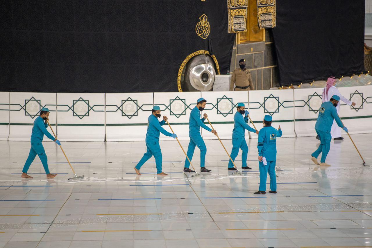قامت الرئاسة العامة لشؤون المسجد الحرام والمسجد النبوي، بغسيل وتعقيم جميع أرجاء المسجد الحرام وساحاته، خلال (15) دقيقة استعدادا لاستقبال الوفد الثاني من المعتمرين.