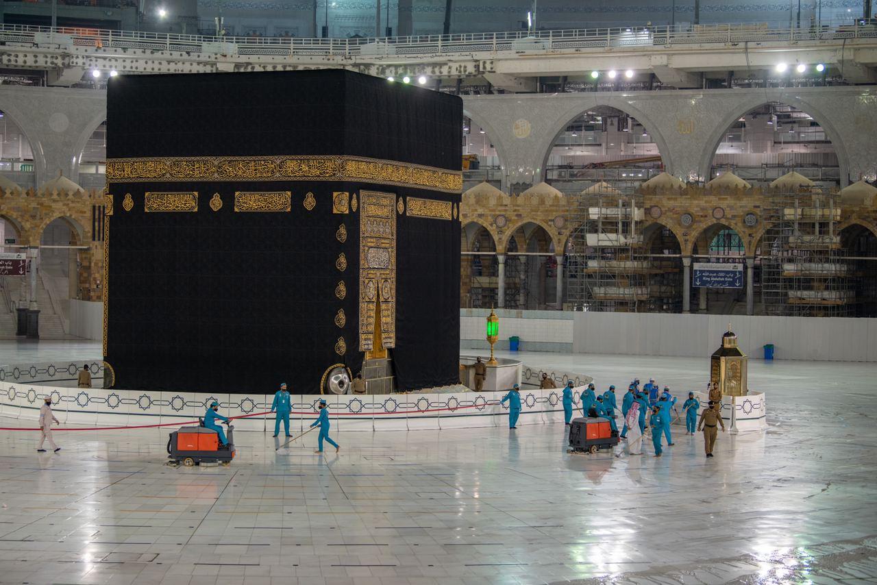 غسل وتعقيم المسجد الحرام خلال (15) دقيقة استعداد لاستقبال الوفد الثاني من المعتمرين