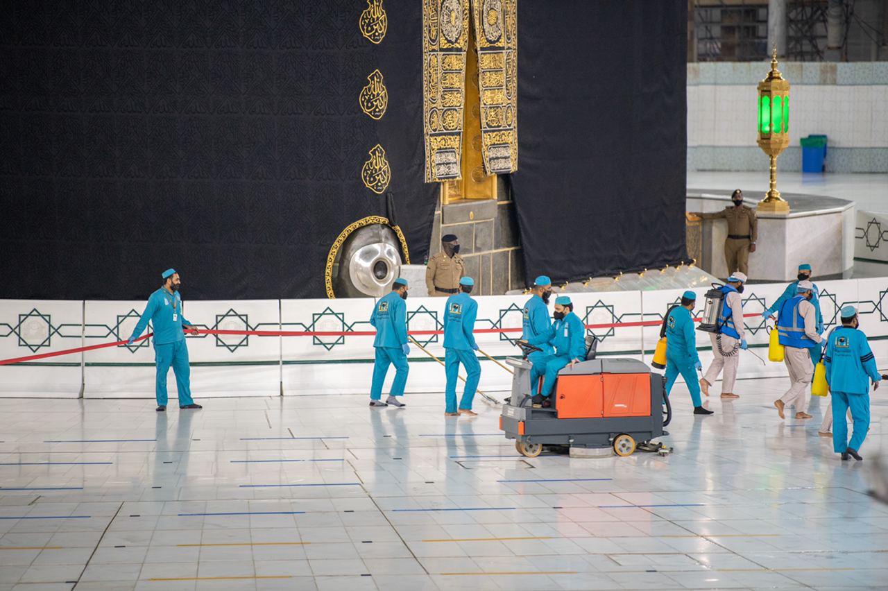 حيث قام بعمليات الغسل والتعقيم أكثر من (400) عامل، بعد أن غادر معتمرين الوفد الأول والبالغ عددهم (1000) معتمر البيت العتيق بعد أداءهم لمناسك العمرة.