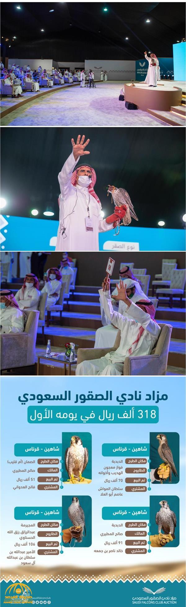 شهد مزاد نادي الصقور السعودي اليوم الأحد، بيع 4 صقور من فئة شاهين قرناس بسعر 318 ألف ألف ريال في يومه الأول.