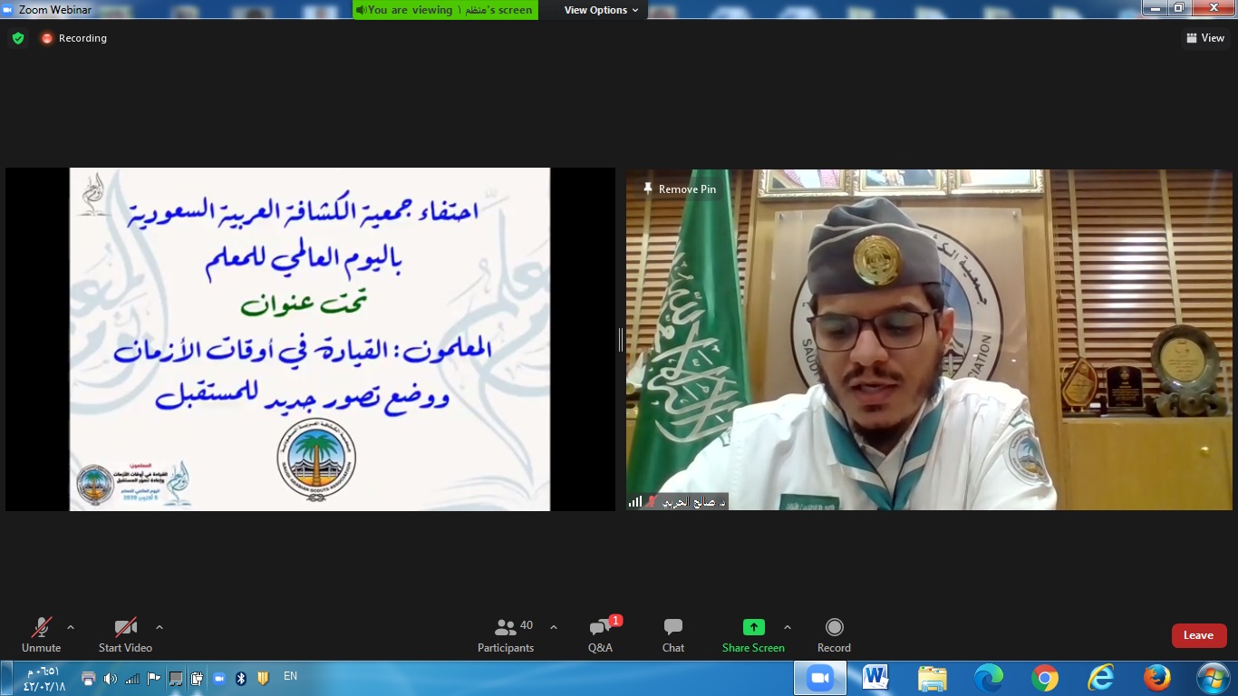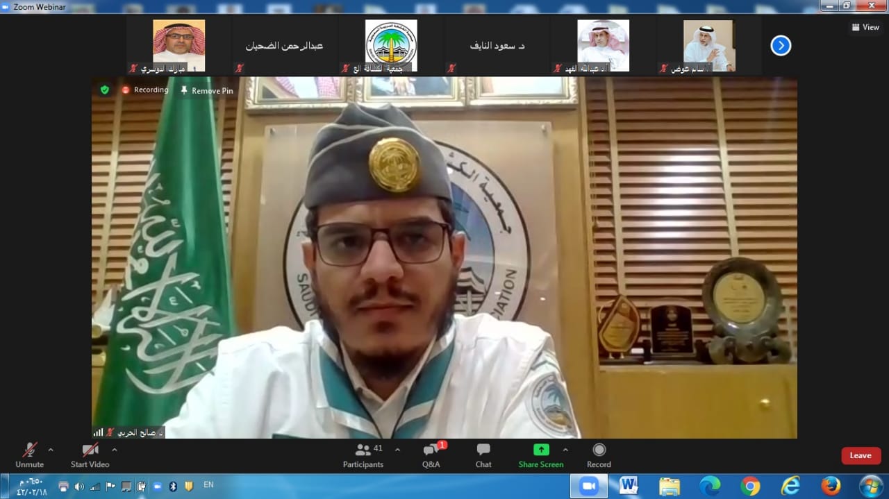 نظمت جمعية الكشافة العربية السعودية ، اليوم ندوة افتراضية بمناسبة اليوم العالمي للمعلم ، الذي يوافق الخامس من أكتوبر في كل عام، ونفذت فعاليات الاحتفاء به اليوم في انحاء العالم تحت شعار “المعلمون: القيادة في أوقات الأزمات، وإعادة تصور المستقبل”، وشارك في الندوة أستاذ المناهج وتطوير التعليم بجامعة الإمام محمد بن سعود الإسلامية الدكتور عبدالله الفهد، ووكيل جامعة حائل الدكتور سعود النايف ، وأمين عام جمعية الكشافة الدكتور صالح الحربي .