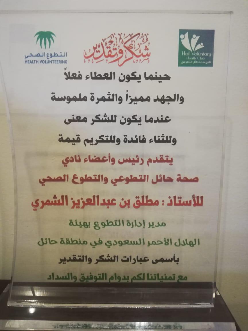 سيف_الشويلعي: حائل : كرم نادي التطوع الصحي بالشؤون الصحية بمنطقة حائل، كلا من مدير التطوع بفرع هيئة الهلال الاحمر السعودي بمنطقة حائل “مطلق عبدالعزيز الشمري” والمتطوع “ناصر عبدالكريم الشمري”.
