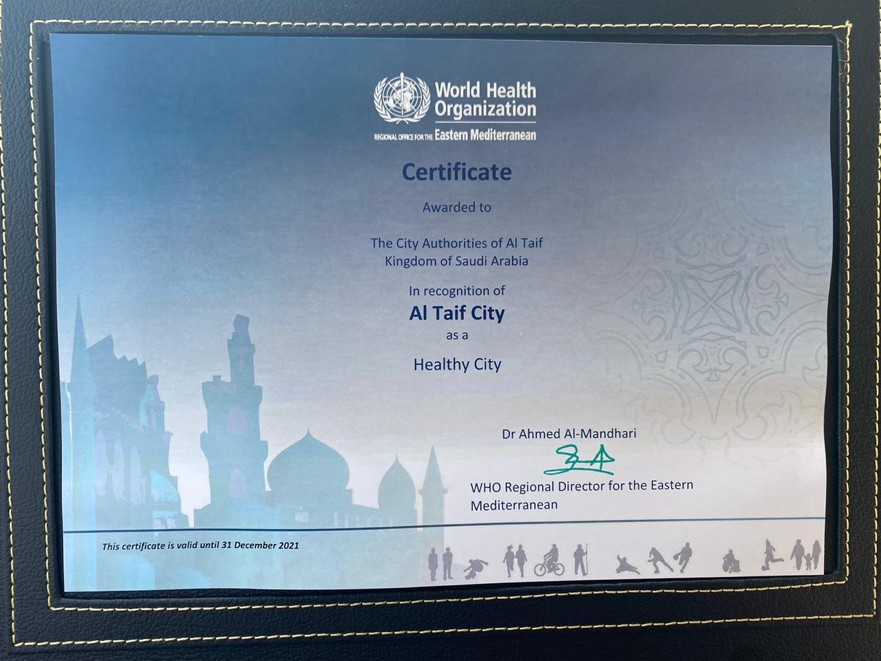 تسلم مستشار خادم الحرمين الشريفين صاحب السمو الملكي الأمير خالد الفيصل. أمير منطقة مكة المكرمة بمكتب سموه بديوان الأمارة اليوم الاربعاء 20/2/1442هـ الشهادة الصادرة من منظمة الصحة العالمية بإعتماد مدينة الطائف كمدينة صحية من قبل معالي وزير الصحة الدكتور توفيق بن فوزان الربيعة وحضر مراسم تسليم شهادة الإعتماد معالي محافظ الطائف رئيس اللجنة العامة لبرنامج مدينة الطائف الصحية الأستاذ سعد بن مقبل الميموني .