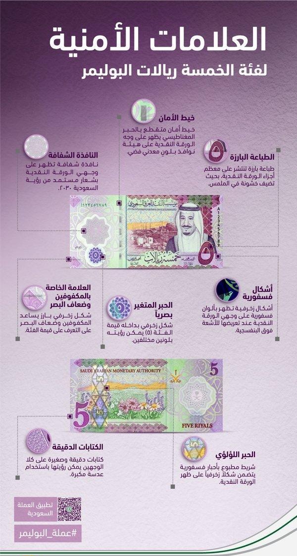 كشفت مؤسسة النقد العربي السعودي “ساما”، عن علامات الأمان في العملة النقدية الجديدة فئة الخمسة ريالات والمصنوعة من مادة البوليمر .