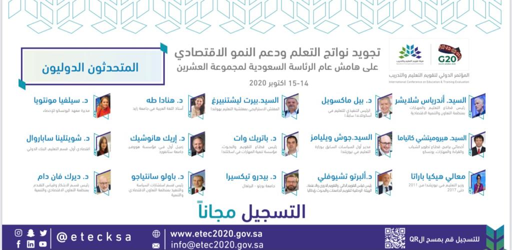 يجتذب المؤتمر الدولي لتقويم التعليم والتدريب، الذي تنظمه هيئة تقويم التعليم والتدريب بالشراكة مع الأمانة السعودية لمجموعة العشرين، خلال 14-15 من أكتوبر الجاري، شخصيات وقيادات وخبراء في تطوير التحليل الاقتصادي للقضايا التعليمية، ومجال ضمان الجودة، وتقييم المدارس، وتطوير التعليم وتحسين جودته وكفاءته على المستوى الوطني، وابتكار السياسات والممارسات التعليمية.