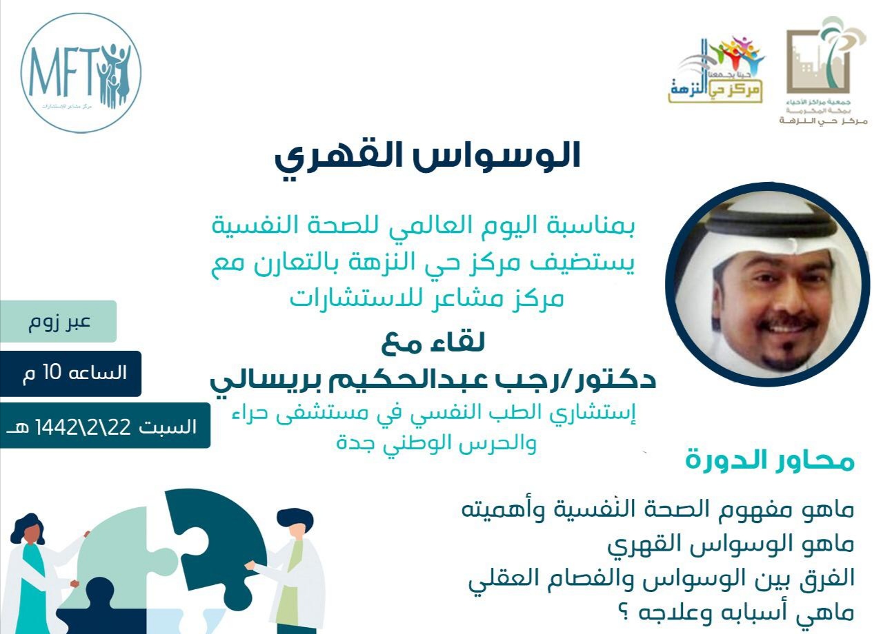 بمناسبة ” اليوم العالمي للصحة النفسية” بادر مركز ” حي النزهة ” بالتعاون مع مركز ” مشاعر للاستشارات ” بناء علي توجيهات رئيس مركز حي النزهة السيد / عادل حافظ – باستضافة الإستشاري الدكتور / رجب عبد الحكيم بريسالي – ( استشاري الطب النفسي ) – في مستشفى حراء و الحرس الوطني بالقاعة الإفتراضية لمركز – ( حي النزهة ) – لتوعية المجتمع عن مفهوم – ( الصحة النفسية ) – و أهميتها