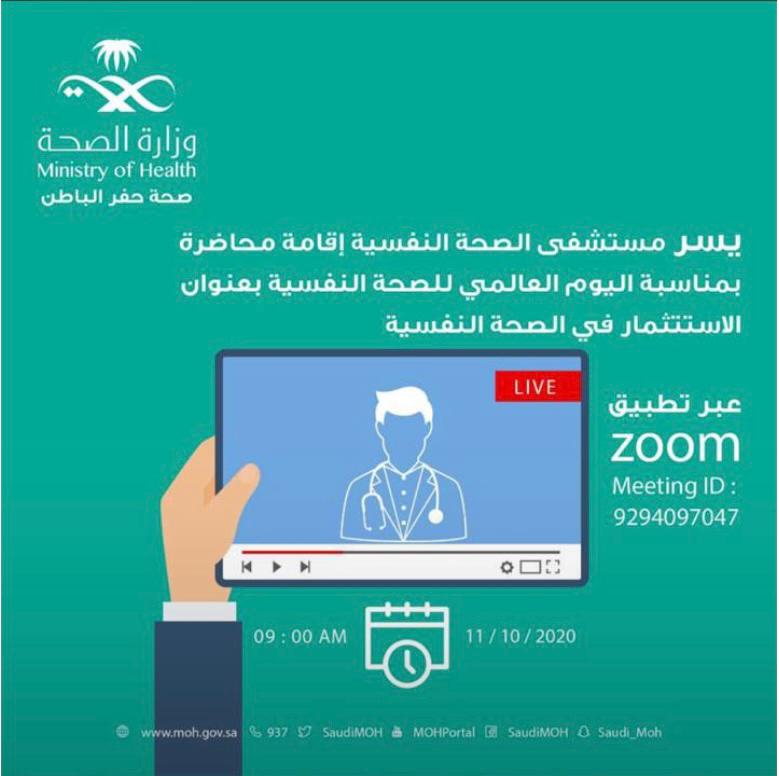 تزامنا مع اليوم العالمي للصحة النفسية نظم مستشفى الصحة النفسية بحفر الباطن محاضرة بعنوان الاستثمار في الصحة النفسية ” عبر تطبيق “zoom” واستهدفت المحاضرة أفراد المجتمع لتوعيتهم بأهمية الحفاظ على الصحة النفسية، كما نفذ المستشفى حملة توعوية في أحد المتنزهات العامة من خلال ركن توعوي لتوعية الزوار باليوم العالمي للصحة النفسية إضافة إلى رفع الوعي الصحي بمشكلات الصحة النفسية وتعزيز السلوك الإيجابي لتحسين جودة الحياة النفسية للمجتمع.