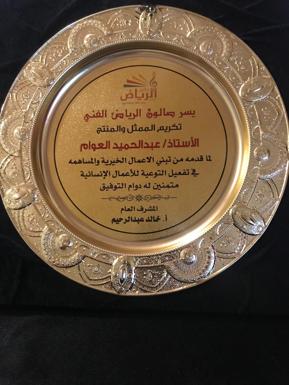 أ. عبدالحميد العوام لما قدمه من تبني للأعمال الخيرية والمساهمة في تفعيل التوعية للأعمال الإنسانية.
