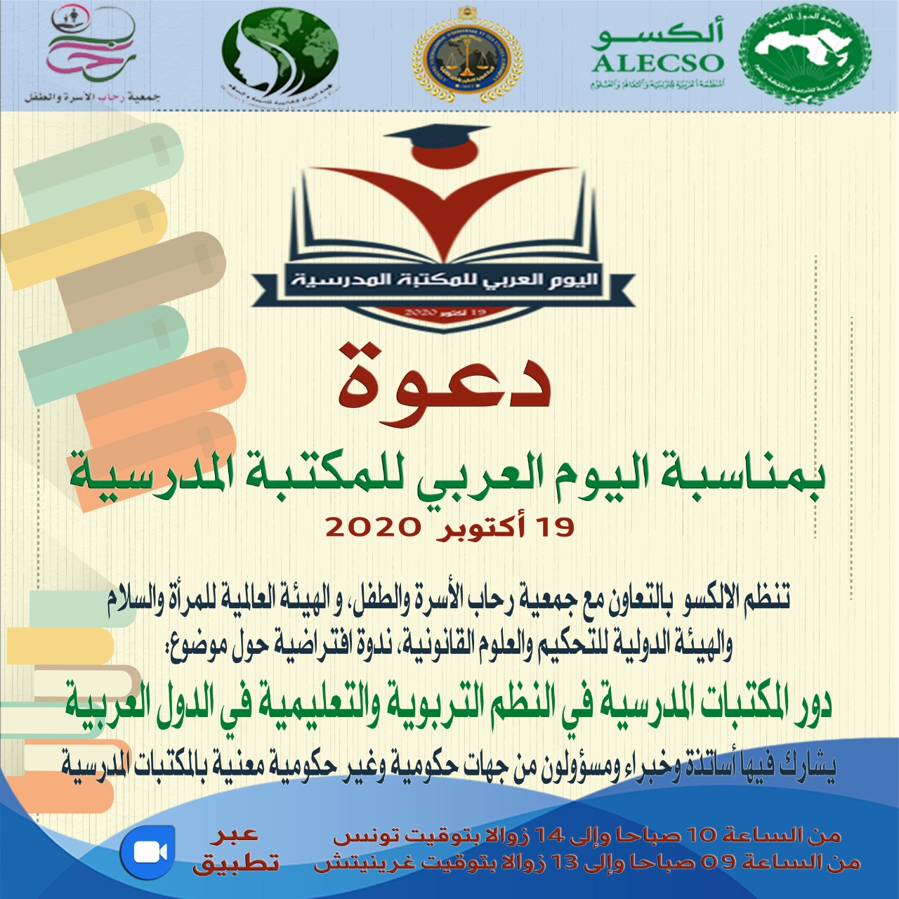 بمناسبة اليوم العربي للمكتبة المدرسية 19 اكتوبر , تنظم اليوم الاثنين الاكسو , وجمعية رحاب الأسرة والطفل بتونس , وهيئة المرأة العالمية للتنمية والسلام بالشرق الأوسط ,والهيئة الدولية للتحكيم والعلوم القانونية بالمغرب , ندوة افتراضية بعنوان ” دور المكتبة المدرسية في النظم التربوية والتعليمية بالدول العربية ” وتحت شعار (المكتبة المدرسية فضاء تعلم وابداع وحرية) بمشاركة نخبة من الأساتذة والخبراء والمسؤولين من جهات حكومية وغير حكومية معنية بالمكتبات المدرسية .