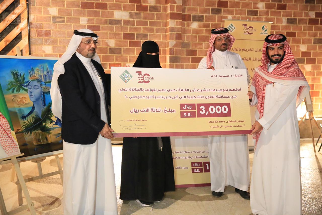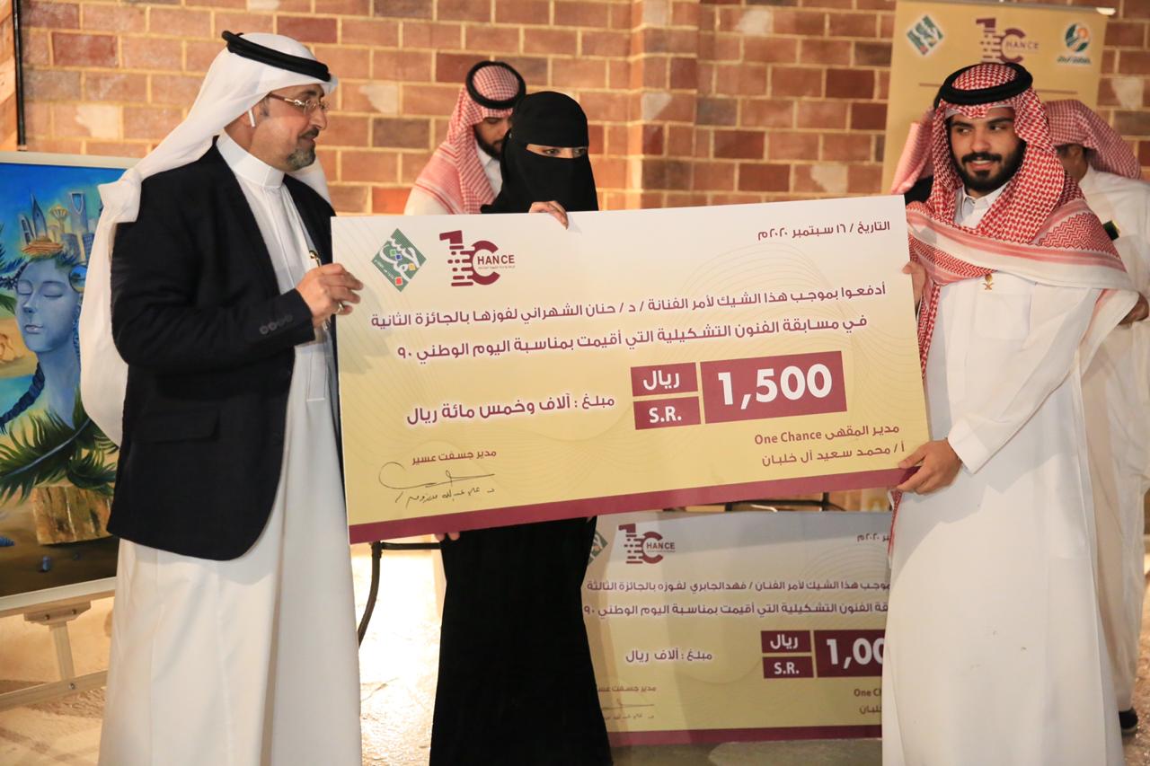 بدعوة من الجمعية السعودية للفنون التشكيلية (جسفت) بعسير، ومقهى الفرصة الواحدة للقهوة المختصة سلم عضو مجلس إدارة غرفة أبها الأستاذ مهدي بن هادي آل هضبان الجوائز للفائزين، وشهادات الشكر للمشاركين في مسابقة الفنون التشكيلية الوطنية التي أقيمت بمناسبة اليوم الوطني للمملكة التسعين، وشارك فيها أكثر من 50 فناناً وفنانة من مختلف مناطق ومدن المملكة.