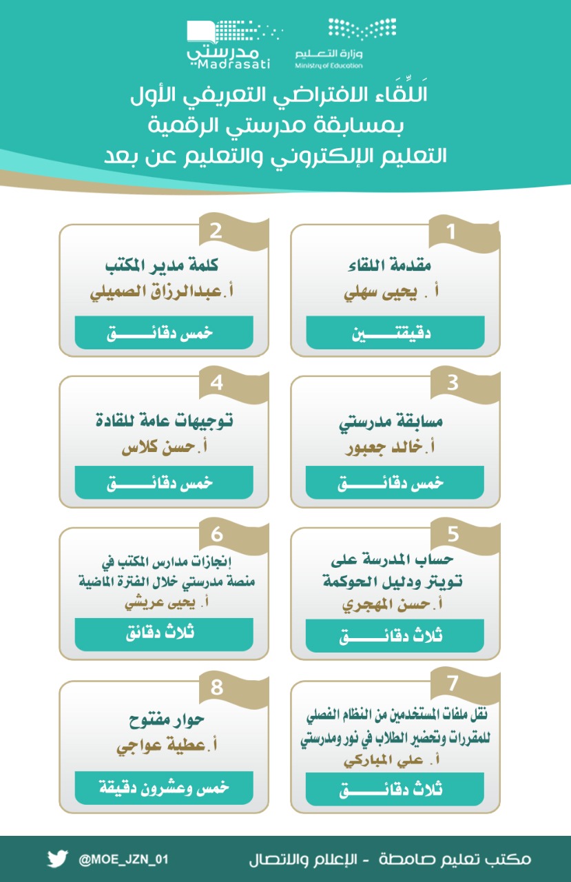 ورحب”الصميلي”في مستهل اللقاء الافتراضي بالجميع مثمناً الجهود المبذولة لدعم العملية التعليمية عبر منصة مدرستي ومقدماً الشكر لمدير عام التعليم بمنطقة جازان على الدعم الدائم للمكتب ومدارسه والتحفيز المستمر مشيراً للدرو الكبير لقادة المدارس في دعم المجتمع التعليمي.