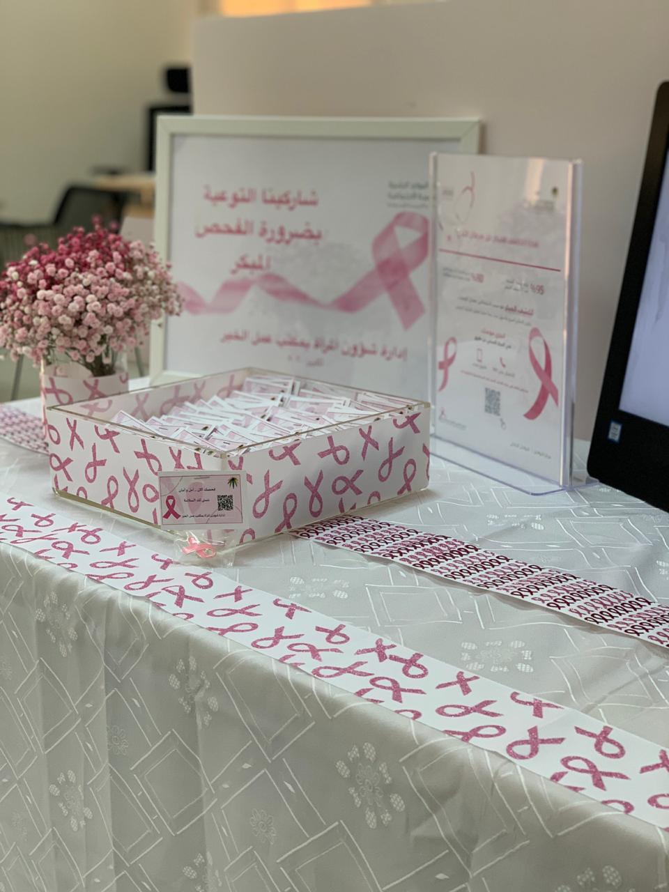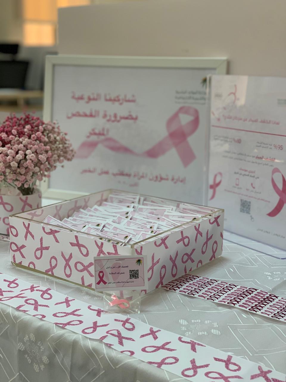 تزامنا مع فعاليات الشهر العالمي للتوعية بـ  سرطان الثدي ، شارك مكتب عمل الخبر ممثلا بإدارة شوؤن عمل المرأه بحملة توعيه وتثقيف بأهمية اجراء الفحص المبكر للكشف عن سرطان الثدي وذلك بعرض ماده تثقيفيه لعميلات المكتب والموظفات لزيادة الوعي بخطورة هذا المرض وأهمية الإبكار في الكشف عنه وعلاجه، ومشاركة منشورات رقمية توعوية.