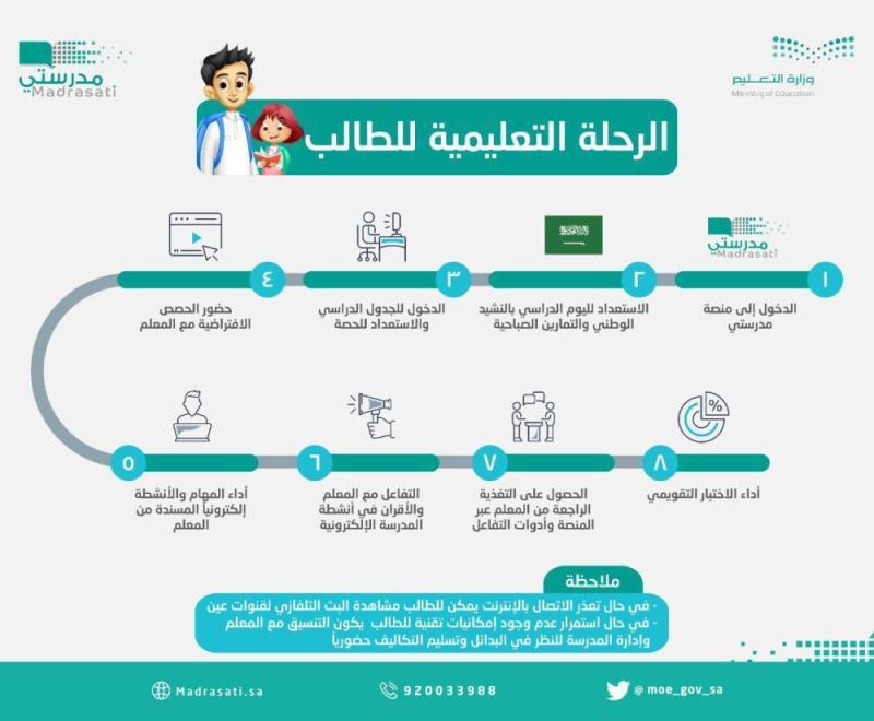 ويقول من جهته معلم اللغة الإنجليزية الأستاذ محمد البلوي بتعليم تبوك: من خلال(منصة مدرستي)الخاصة بالتعليم،يتم تلقي الطلاب بجميع مراحلهم التعليمية اليوم الدراسي بشكل يشبه_إلى حد كبير _اليوم الدراسي في الفصل المدرسي في ظل توقف سير العملية التعليمية.ويستدرك الأستاذ البلوي مفصلا استدراكه:
