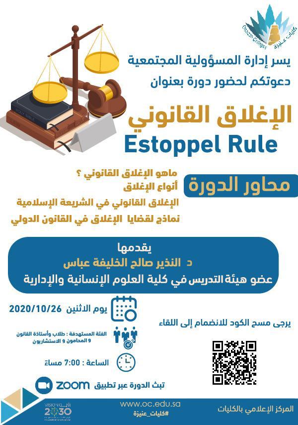 وبين المشرف العام على كليات عنيزة الدكتور عبدالله بن صالح الشتيوي أن الدورة تاتي ضمن سلسلة الدورات المجدولة التي تقدمها الكليات لزيادة الوعي المجتمعي فيما يتوافق مع الظروف الحالية والتي تقام عن بعد من خلال منصة زووم مبيننا الى أهمية تسليط الضوء على المجالات القانونية التي تساهم في التعريف باللوائح والاجراءات القانونية