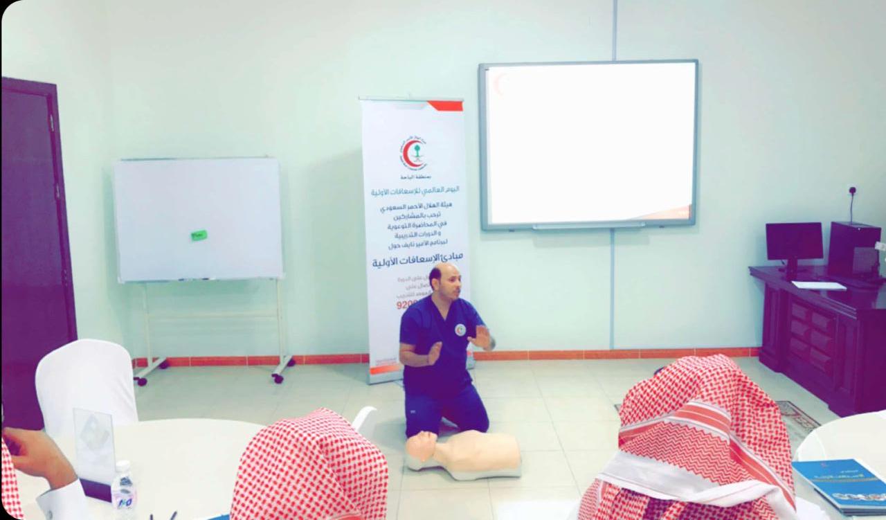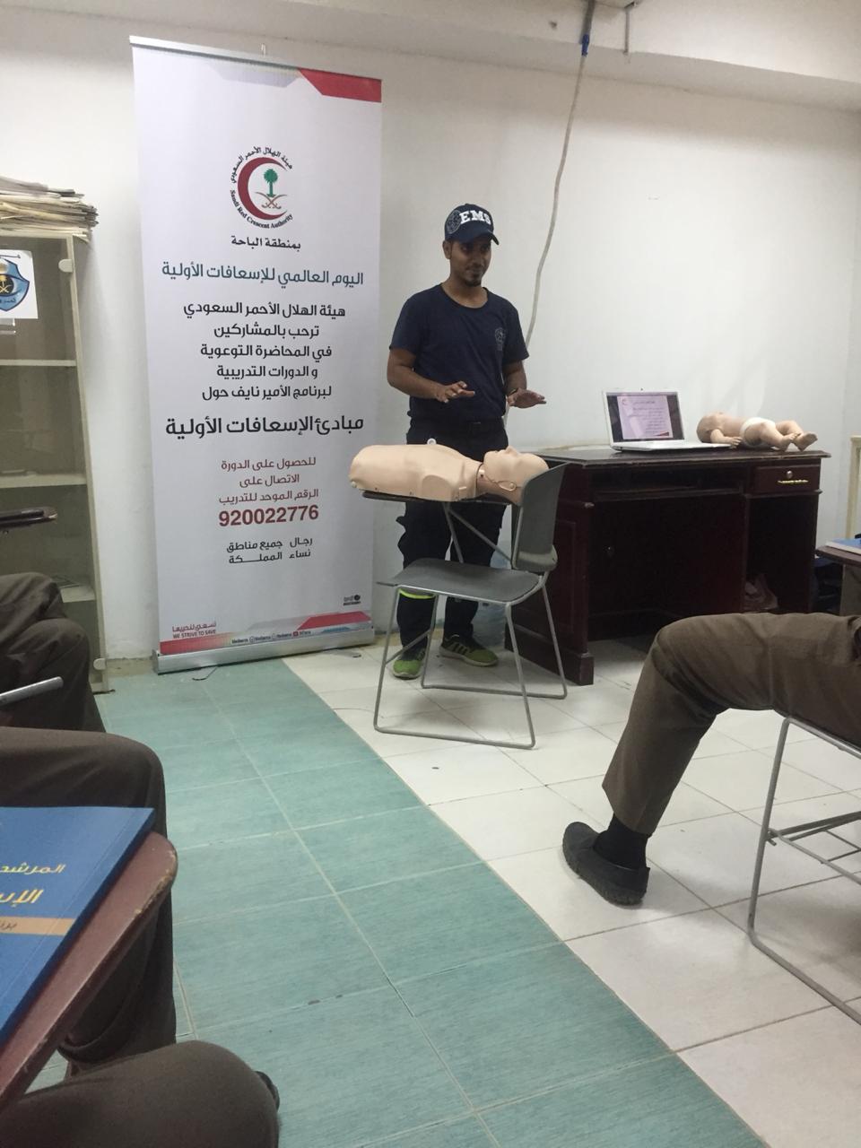 إحتفل فرع هيئة الهلال الأحمر السعودي بمنطقة الباحة باليوم العالمي للإسعافات الأولية الموافق الثامن من شهر سبتمبر لعام ٢٠١٨ م ؛ و ذلك إستجابة لتوجيهات معالي رئيس هيئة الهلال الأحمر السعودي الدكتور : محمد القاسم و بمتابعة من قبل مدير عام فرع الهيئة بمنطقة الباحة الأستاذ : خالد الغامدي ،