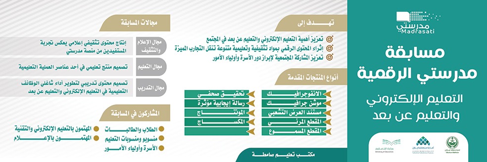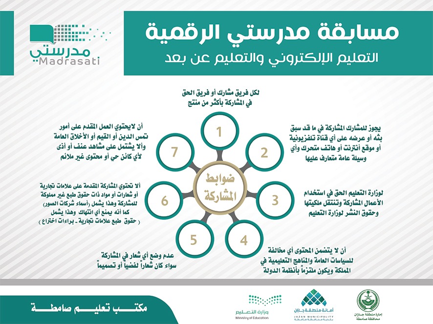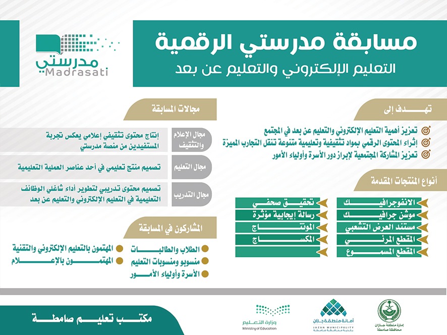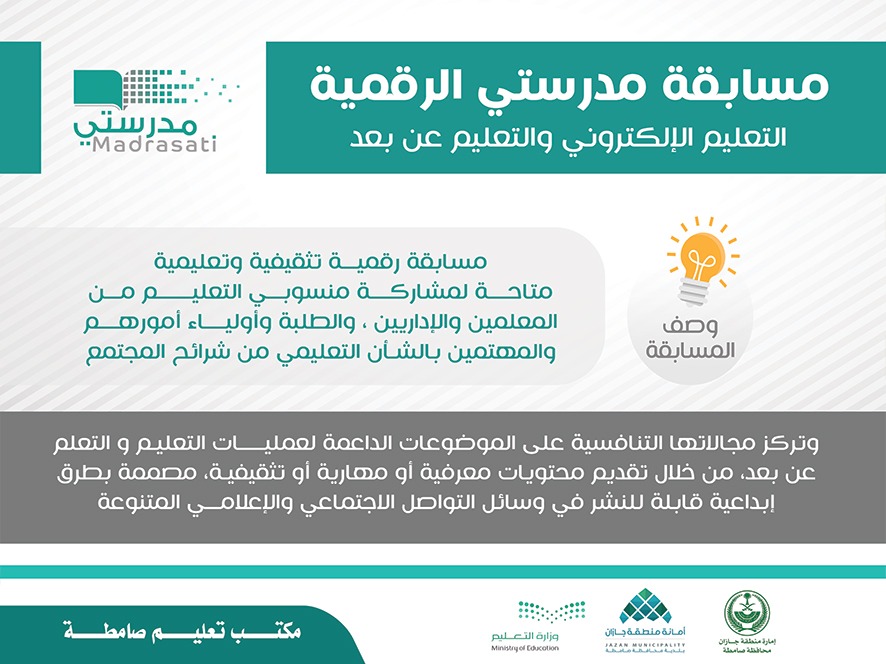 ودعا مدير مكتب تعليم صامطة الأستاذ عبدالرزاق بن محمد الصميلي كافة مدارس المكتب والمجتمع التعليمي ووسائل الإعلام في للمشاركة في مسابقة مدرستي الرقمية للتعليم الإلكتروني والتعليم عن بُعد التي أطلقتها وزارة التعليم أخيراً لتعزيز مشاركة منسوبي التعليم من المعلمين والإداريين والطلبة وأولياء أمورهم والمهتمين بالشأن التعليمي من شرائح المجتمع المختلفة في نشر ثقافة التعليم عن بُعد وإثراء المحتوى الرقمي بمواد إبداعية تنقل التجارب المميزة.