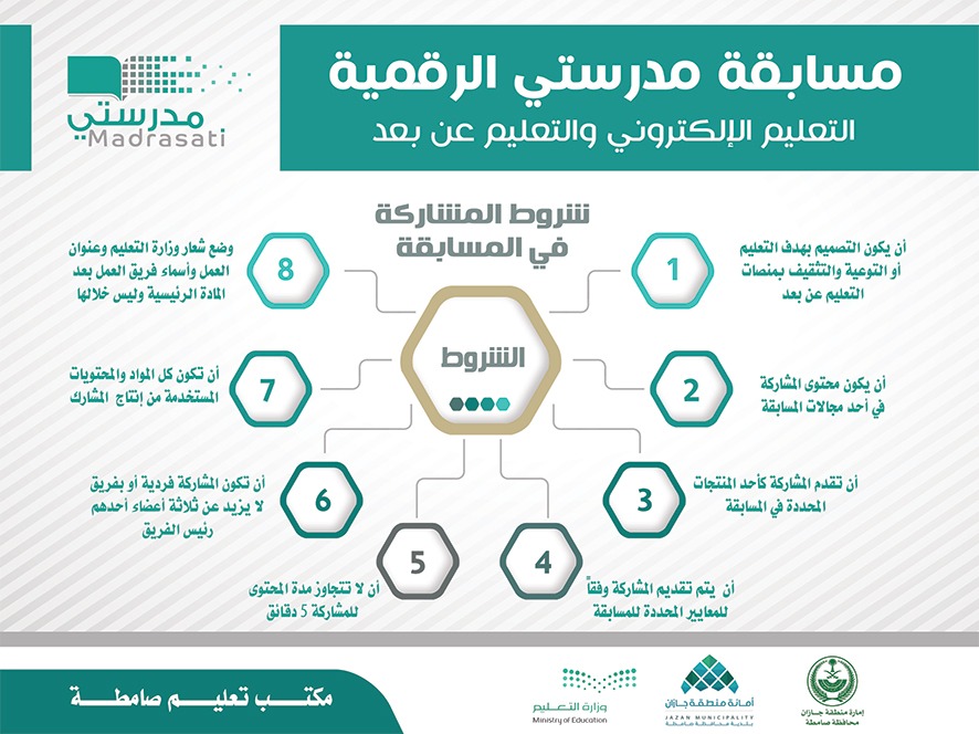 وقال إن المسابقة تتركز مجالاتها التنافسية على الموضوعات الداعمة لعمليات التعليم والتعلم عن بُعد من خلال 3 مجالات رئيسية بدءا من مجال التعليم من خلال تصميم محتوى تعليمي في أحد عناصر العملية التعليمية إضافة لمجال الإعلام والتثقيف من خلال إنتاج محتوى تثقيفي إعلامي يعكس تجربة المستفيدين من منصة مدرستي وصولاً لمجال التدريب من خلال تصميم محتوى تدريبي لتطوير أداء شاغلي الوظائف التعليمية في التعليم الإلكتروني والتعليم عن بُعد مضيفا أن آلية المشاركة في المسابقة تكون من خلال تلقي المدرسة المنتجات الخاصة بالطلاب والطالبات وأولياء أمورهم ومنسوبي المدرسة من المعلمين والإداريين وفق المجالات الـ3 المحدّدة وفرزها وتقييمها ونشر ما يرشح منها في حساب مكتب تعليم صامطة على منصة تويتر ثم يتولّى مكتب التعليم اختيار أفضل النماذج وتقييمها وإرسالها إلى الإدارة العامة للتعليم بمنطقة جازان ليتم البدء في إجراءات المرحلة الختامية للمسابقة والتحكيم النهائي للمنتجات المقدمة على مستوى إدارات التعليم والنشر للمنتجات المرشحة على حساب إدارة تعليم جازان مقدماً شكره لرئيس بلدية صامطة على التعاون في نشر ثقافة المسابقة عبر اللوحات الإعلانية في المحافظة .