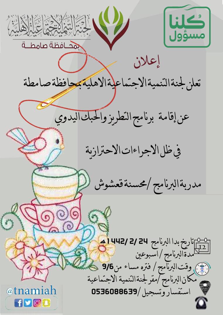 اختتم القسم النسائي بالجنة التنمية الإجتماعية الأهلية بصامطة برنامج (التطريز والحبك اليدوي) الخاص بالفتيات وذلك إبتداءً من يوم الأحد الموافق١٤٤٢/٢/٢٤ ولمدة عشرة أيام متتالية.