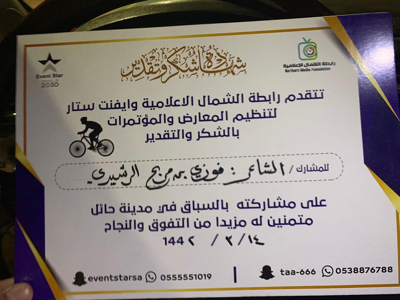قدمت رابطة الشمال الإعلامية “وايفنت ستار” لتنظيم المعارض والمؤتمرات شهادة شكر وتقدير للشاعر “فوزي بن مربح الرشيدي”، جاء ذلك نظير مشاركته بالسباق في مدينة حائل.