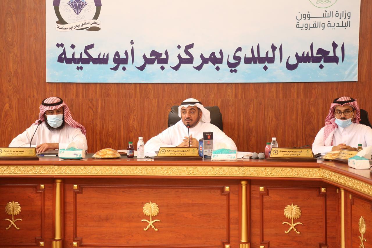 عقد المجلس البلدي بمركز بحر أبو سكينة صباح اليوم الأثنين ١٦ ربيع الأول ١٤٤٢هـ . جلسة أعماله رقم ( ٦٣) برئاسة الأستاذ / مصهف علي عسيري رئيس المجلس البلدي وبحضور المهندس / نايف بن علي الغامدي رئيس بلدية مركز بحر أبو سكينة ، وكافة أعضاء المجلس، وذلك تنفيذا لتوجيه صاحب السمو الملكي أمير منطقة عسير الأمير / تركي بن طلال والذي تضمن إشراك فئة من الشباب والشابات في جلسات المجلس المحلي والبلدي وقد شارك نخبة من شباب مركزي ( بحر أبو سكينة وخيم وتم مناقشة آلية المجالس البلدية ودور الشباب فيها ، كما طرح رئيس المحلس البلدي مشروع تحسين المشهد الحضري واستراتيجية منطقة عسير ونماذج من مشروعات البلدية ،