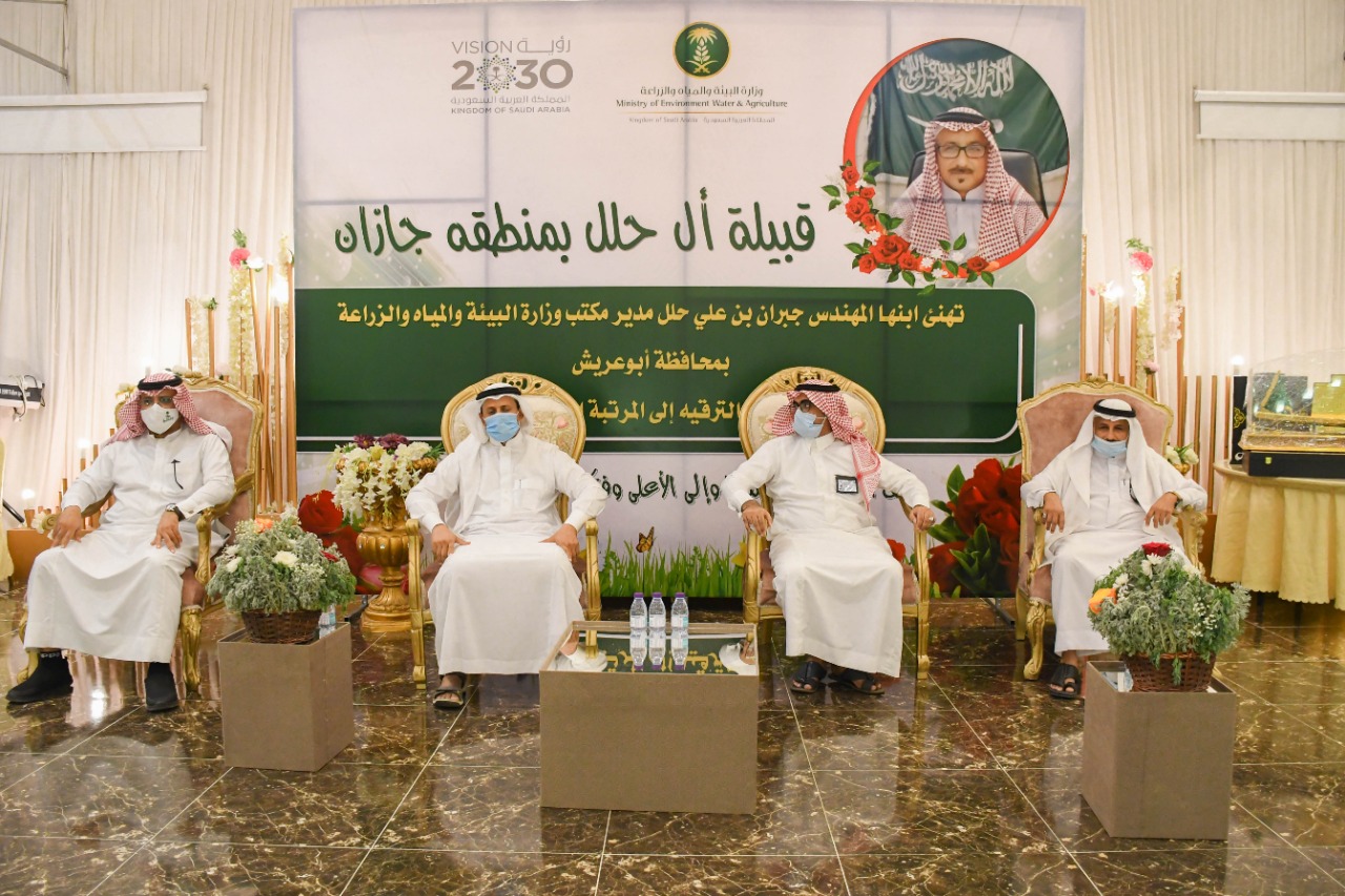 على شرف سعادة وكيل محافظة ابوعريش الأستاذ حسن حكمي وبحضور سعادة نائب مدير عام فرع وزارة البيئة والمياه والزراعة بمنطقة جازان المهندس عبدالعزيز المنيع تحتفل قبيله آل حلل بمنطقة جازان اليوم بمناسبة ترقيه ابنها مدير مكتب وزارة البيئة والمياه والزراعة بمحافظة ابوعريش المهندس جبران بن علي حلل إلى المرتبة الثانية عشرة