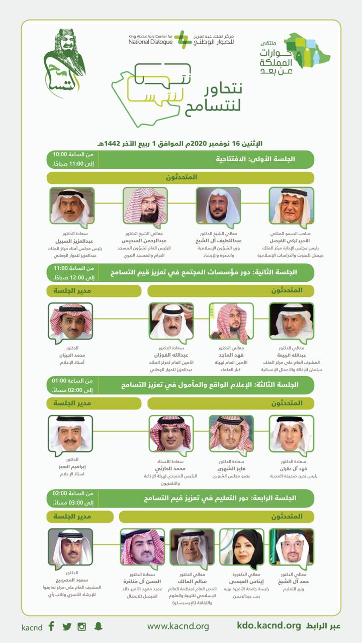 تنطلق اليوم الأثنين 1 ربيع الآخر 1442هـ الموافق 16 نوفمبر 2020م ملتقى حوارات المملكة الثالث بعنوان: ” نتحاور لنتسامح “،وذلك عبر شبكة الإنترنت، تزامناً مع اليوم العالمي للتسامح،