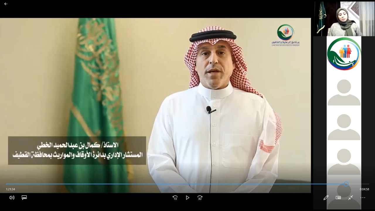 وقد شارك في هذه الأمسية العديد من الجهات الحكومية والأهلية التي اسهمت في اثراء هذه الأمسية التي ركزت في مضامينها على العديد من المحاور الوطنية مثل تنمية الشباب ودور الإعلام في تعزيز الهوية الوطنية ورعاية الموهوبين في ظل الرؤية الوطنية 2030 وحول الاحتضان النفسي للشباب ومساعدتهم لتحقيق الانجازات الوطنية التي تخدم الذات وتسهم في بناء الوطن. كما احتوت الأمسية على فيديو توثيقي لبعض انجازات برنامج الرعاية والتأهيل وقد شكر البرنامج جميع المشاركين والقائمين على هذه الامسية ومن حضرها عبر منصة الزوم ..