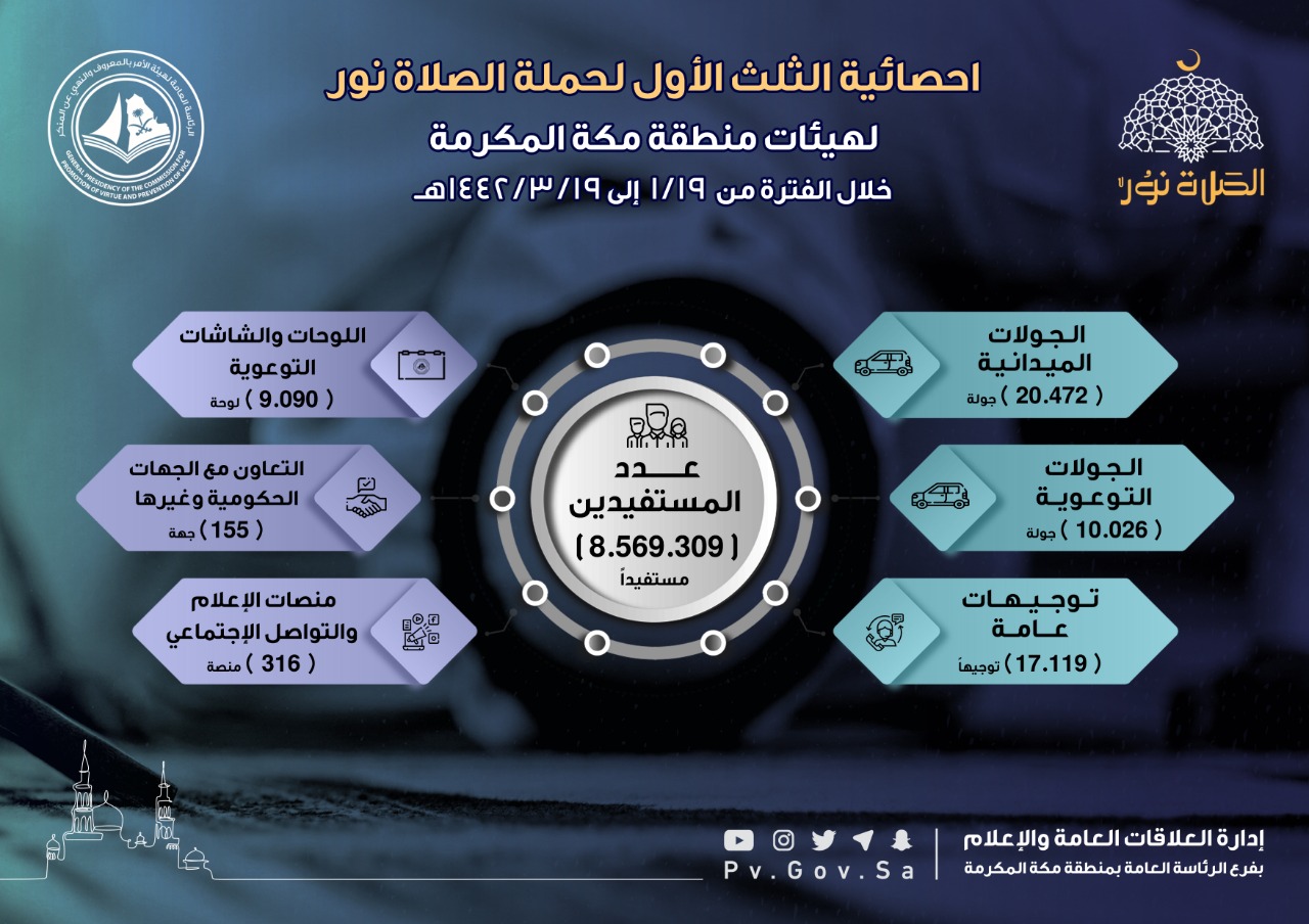 كشف فرع الرئاسة العامة لهيئة الأمر بالمعروف والنهي عن المنكر بمنطقة مكة المكرمة عن احصائية الثلث الأول للبرامج والفعاليات التوعوية والميدانية والإعلامية والتي بلغت ( 57178) منشطاً ميدانياً وتوعوياً وإعلامياً. والمقدمة في منطقة مكة المكرمة ومحافظاتها من خلال العمل الميداني والتوعوي لأعضاء هيئة الأمر بالمعروف والنهي عن المنكر في الأسواق والمجمعات التجارية والميادين والمتنزهات والجهات ذات العلاقة الحكومية والأهلية. تفعيلاً لبرامج وأنشطة حملة الصلاة نور عبر عدة وسائل من أبرزها الشاشات الإلكترونية واللوحات الثابتة والمصليات المتنقلة مع بذل التوجيه والنصح بالحكمة والقول اللين الحسن.