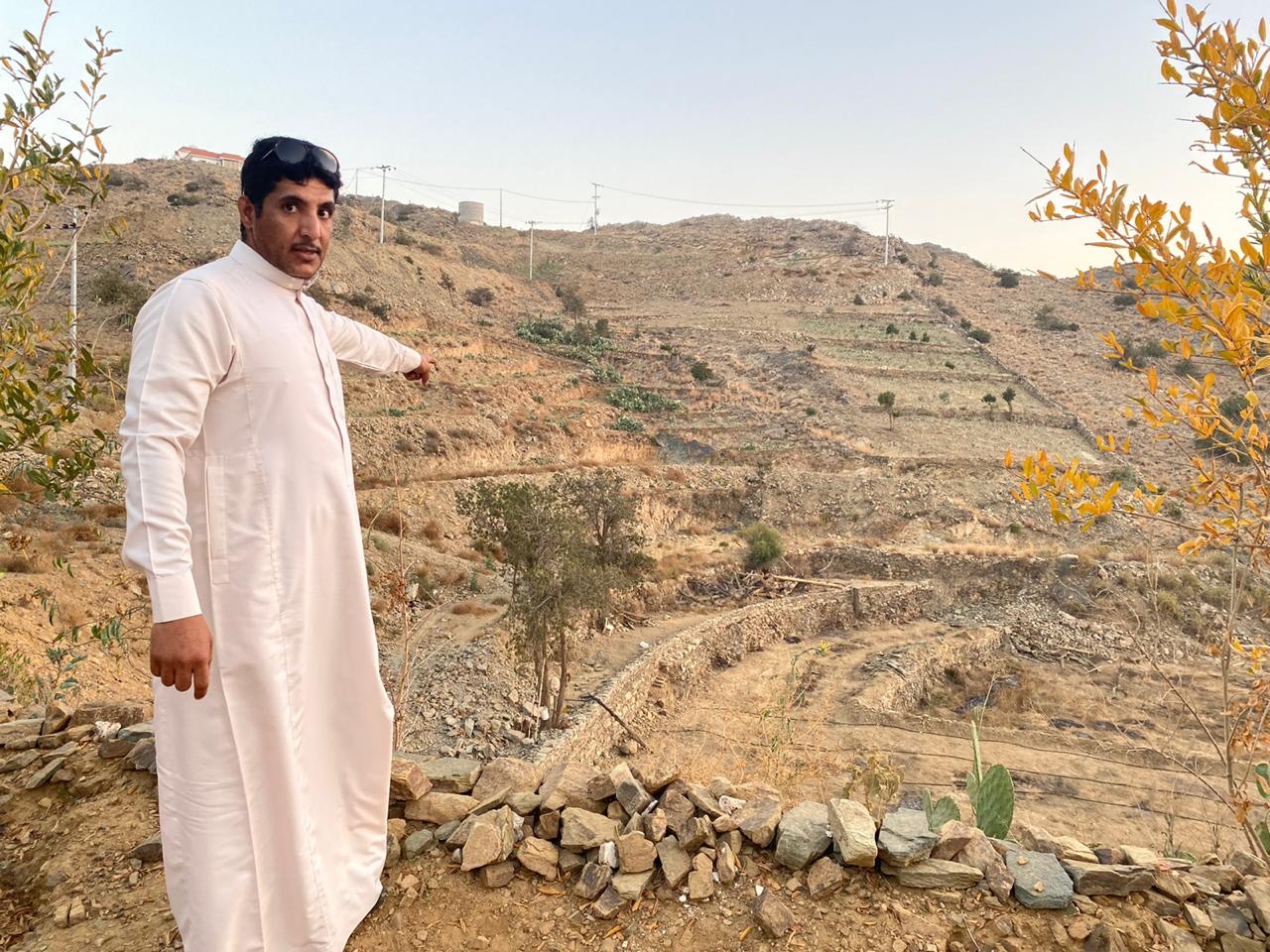 يتواجد في مزرعته بقرية حميم غامد، وبدأ حديثه بأنه بدأ المشروع بإمكانيات بسيطة ومتواضعة  ومع الطموح والعزيمة والصبر أعاد تحسين المصاطب الزراعية وتأهيلها مثلما كانت عليه في السابق، مع إضافة بعض  السلالم الحجرية ليسهل التنقل بين تلك المدرجات، استغرق العمل في بناء تلك المدرجات الزراعية واستصلاح أراضيها ما يقارب ٣ السنوات ومازال البناء مستمرًا إلى يومنا هذا.  ويضيف  بأن العمل أخذ منه  الكثير من الجهد، الوقت, والشباب، والصحة إلا أنه تجاوز كل تلك المتاعب والمصاعب بالاستعانة  بالخالق عز وجل والاستمرار في تحقيق الطموح.