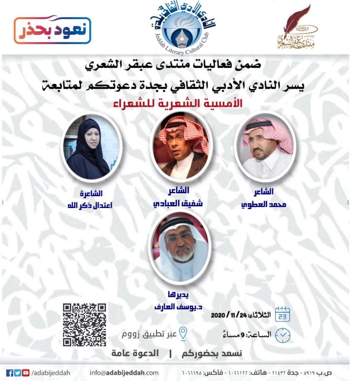 يقيم منتدى عبقر الشعري بالنادي الأدبي الثقافي بجدة، أمسية شعرية يحييها كل من: الشاعر محمد العطوي، والشاعر شفيق العبادي،