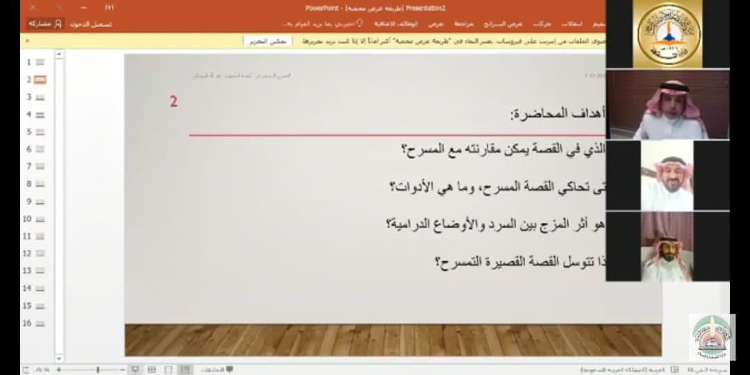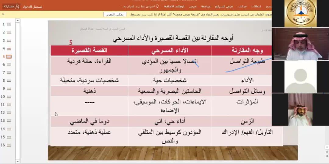 وفي إيراده للتقنيات المشتركة بين المجالين، عرض الوصالي شرائح الكترونية للتفريق بين النص المسرحي والقصة القصيرة ثم شريحة أخرى تبين الفرق بين القصة والأداء المسرحي مؤكدا إن رسم المشهد(المشهدية) في القصة والحوار هما من أهم المشتركات بين المسرح والقصة ذلك عندما يحل البعد الدرامي المشهدي في تلك القصص محل البعد السردي الإخباري، أي توفر شحنات درامية عالية في وصف احداث المشهد القصصي، فيبدو وكأنه حينها “يتطلع إلى حالة” مسرحية، وبالتالي يتم استحضار الأثر المسرحي لدى القارئ. عندما تمزج القصة القصيرة بين موارد الخيال السردي وموارد الدراما، فإنها تصبح نوعًا هجينًا متعدد الاستخدامات، هذا ما يدعو إلى دراسة طبيعة وأنواع التمسرح المتجسدة في القصة القصيرة وفحص طاقتها الجمالية