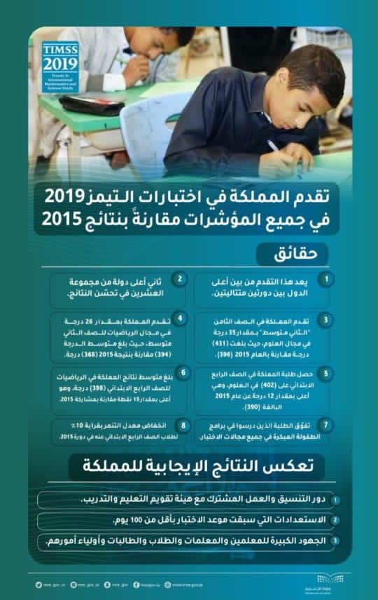 وكانت هيئة تقويم التعليم والتدريب قد أعلنت عن نتائج طلبة المملكة في اختبار TIMSS 2019 في الرياضيات والعلوم للصفين الرابع الابتدائي والثاني المتوسط، الذي تنظمه الجمعية الدولية لتقييم التحصيل «IEA» في أكثر من 60 دولة حول العالم، ونفذته الهيئة بالشراكة مع وزارة التعليم، وشمل أكثر من 11 ألف طالب وطالبة يمثلون كافة مناطق المملكة.