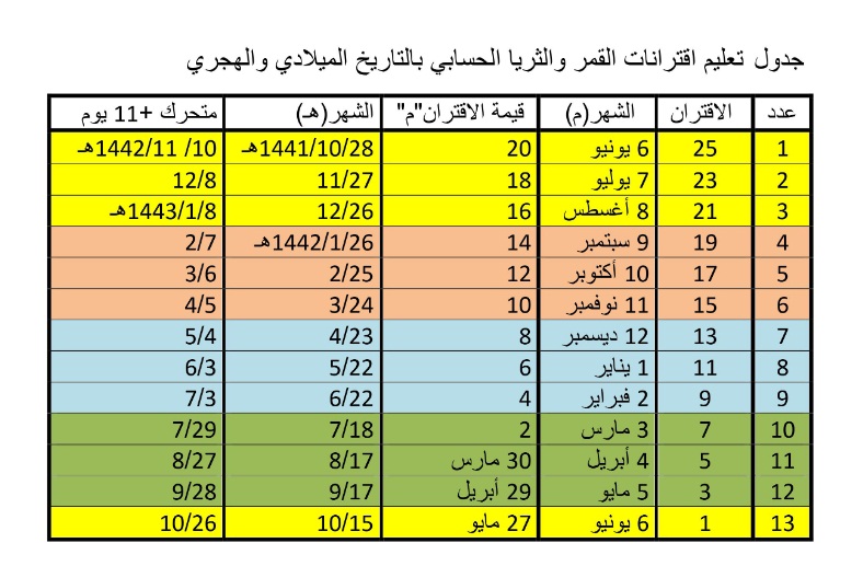 قام المفكر الإسلامي في البحوث الشرعية، والعلوم الفلكية، المشارك في حساب الأهلة وفصول السنة ومواسمها وظروفها المناخية، الأستاذ / ماجد ممدوح الرخيص موضحاً لصحيفة – الشمال – “الإلكترونية” شرح اقترانات القمر والثريا، بالتاريخ الميلادي ومايقابله بالتاريخ الهجري، وذلك لأهمية، هذا الحساب عند العرب لتحديد المواسم وفصول السنة.