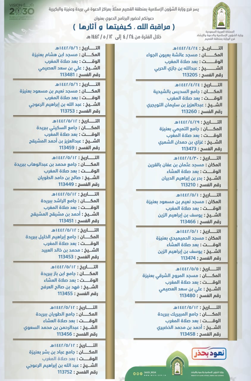 يشارك فيه نخبة من الدعاة بجوامع ومساجد المنطقة ، وذلك خلال الفترة من 22/ 4 إلى 12 / 5 / 1442هـ.