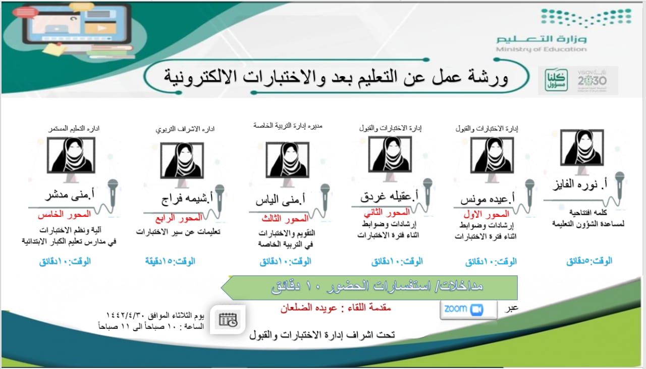 تحت رعاية المساعدة للمدير العام للشؤون التعليمه الاستاذه نوره الفايز وبأشراف مديره إدارة الاختبارات والقبول الأستاذة نوال المجلاد إقامة إدارة الاختبارات والقبول بنات ورشة عمل عن التعليم عن بعد والاختبارات الإلكترونيه اليوم الثلاثاء الموافق 1442/4/30هـ عن بعد عبر برنامج “زووم “.