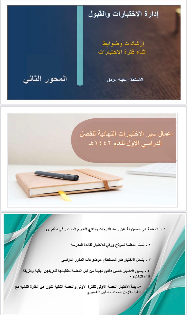 وتناولت إدارة الاختبارات والقبول المحور الأول وكان عن إرشادات وضوابط اثناء فترة الاختبارات من تنفيذ الأستاذه عيده العنزي والأستاذه عقيله العنزي والأستاذه عويده الضلعان