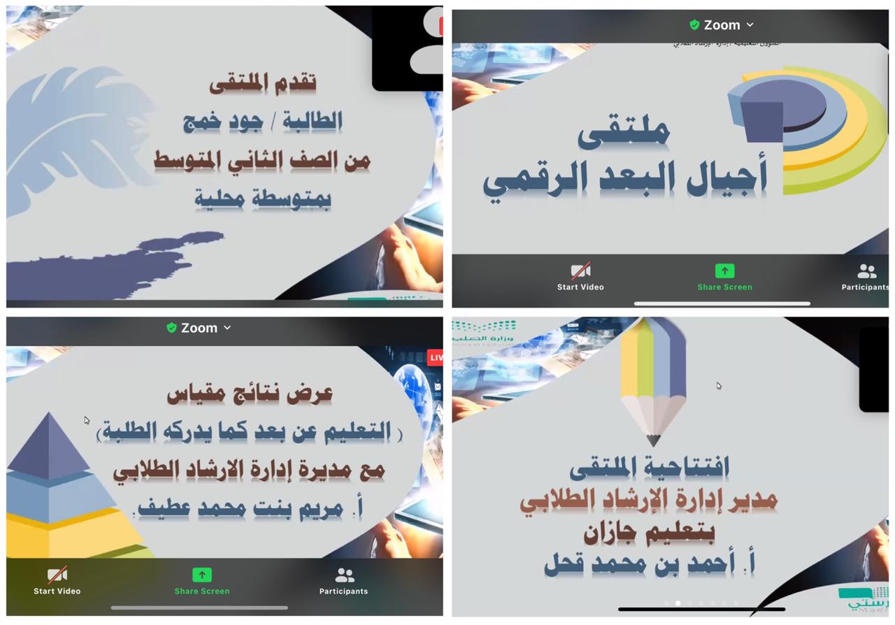 نظمت الإدارة العامة للتعليم بمنطقة جازان ممثلة بإدارة الإرشاد الطلابي مساء أمس الاثنين ملتقى أجيال البعد الرقمي وذلك عن بعد عبر منصة zoom بحضور أكثر من (1000) مشارك ومشاركة من طلاب وطالبات تعليم جازان.