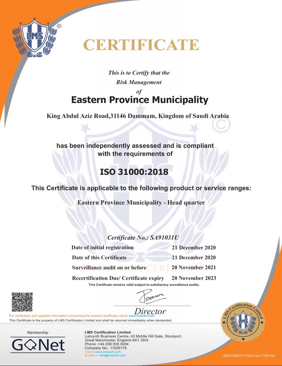 حصلت أمانة المنطقة الشرقية على شهادة الآيزو الخاصة بإدارة المخاطر (ISO 31000)، وذلك بعد تطبيقها كافة المعايير الدولية لنظام إدارة المخاطر على مستوى ‏الأمانة.