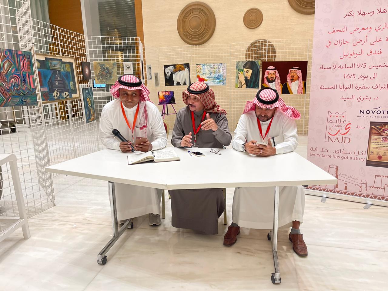وعددمن من الاعلاميين والصحفيين معرض جالري ومعرض التحف الفنيةعلى ارض جازان في فندق نوفتيل جازان للفنانة التشكيلية سفيرة النوايا الحسنةالاستاذة بشرى السيوذلك مساء امس الخميس الموافق ٩ / ٥ / ١٤٤٢هـ، بفندق نوفتيل وتجول الحضور في المعرض الفني واستمعوالشرح من الاستاذة بشرى السيد عن معاني اللوحات المعروضة لها وشارك في المعرض الفني كلا من الفنانات ، خديجة هرملي ، ندى جعفري ، ندى محمد.