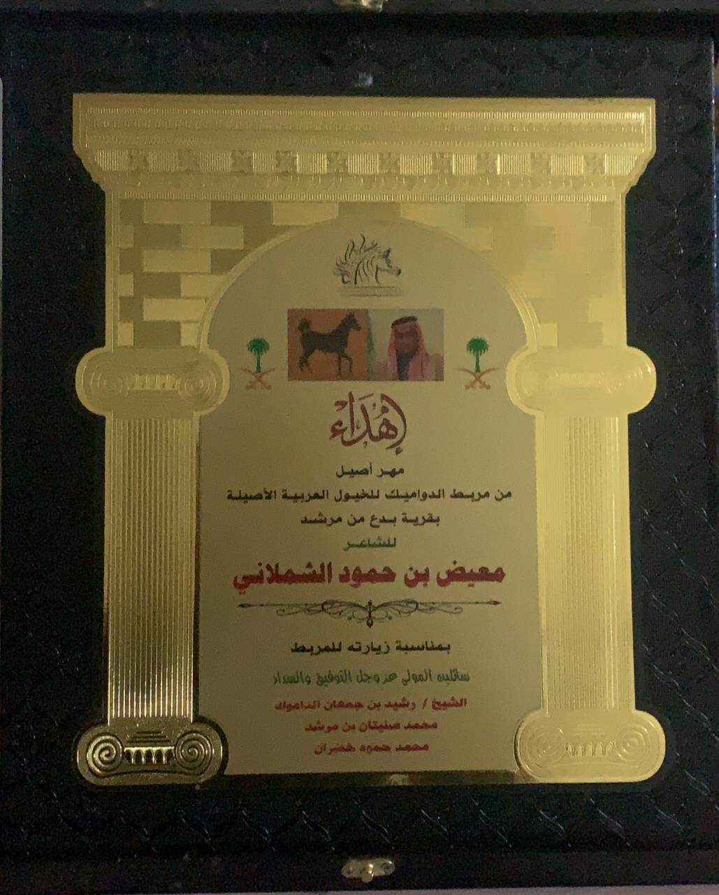 وقد عبر الشاعر معيض العنزي عن فرحته بهذه الهدية وقال : انه لشرف لي أن اتلقى مثل هذه الهدية وخاصة وهي من نوع فاخر ومن اعرق السلالات العربية .