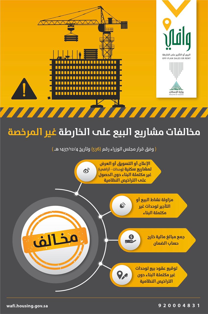 يُذكر أن برنامج البيع على الخارطة (وافي) وفي إطار تسهيل الإجراءات وتحفيز الاستثمار في هذا القطاع الحيوي، أتاح التقدم الكترونياً من خلال الرابط wafi.housing.gov.sa للحصول على رخص البيع أو التسويق أو العرض لمختلف أغراض التطوير العقاري للمشاريع السكنية، التجارية، الصناعية، السياحية، أو الصحية، وكذلك رخصة تطوير الأراضي الخام لأي من تلك الأغراض.