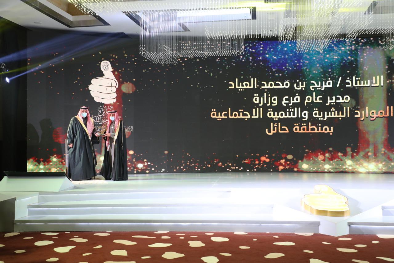 وعبر مدير عام فرع وزارة الموارد البشرية والتنمية الاجتماعية بمنطقة حائل الاستاذ فريح محمد العياد عن شكره وتقديره لصاحب السمو الملكي الأمير عبدالعزيز بن سعد بن عبدالعزيز أمير منطقة حائل حفظه الله ورعاه والذي زرع بدعمه وإهتمامه بصمة العمل في الجد والاجتهاد .